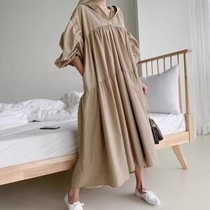 フード付きがおしゃれなVネックロングワンピースです。