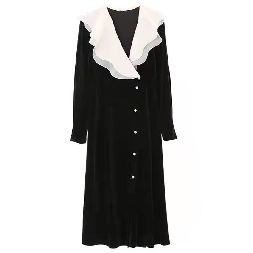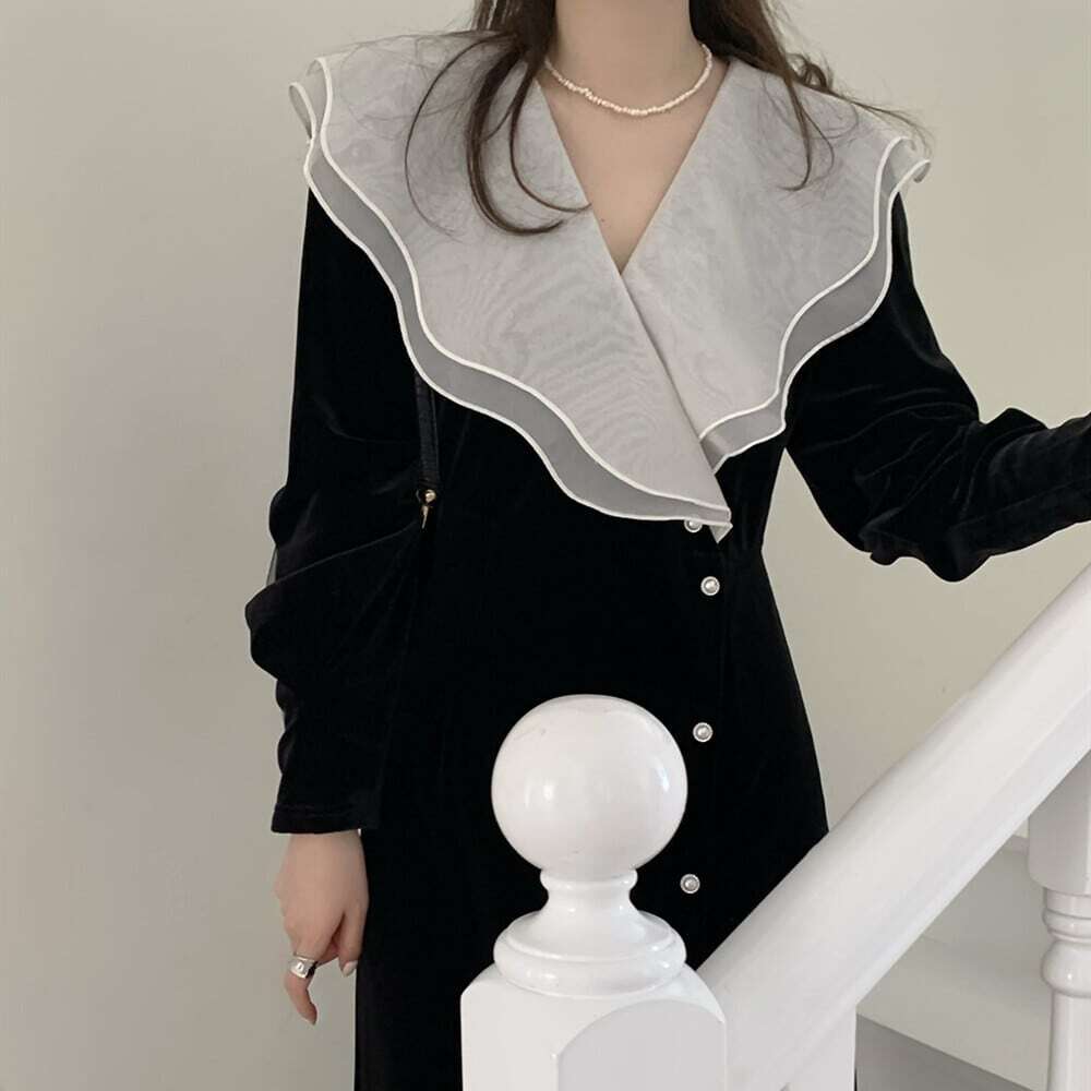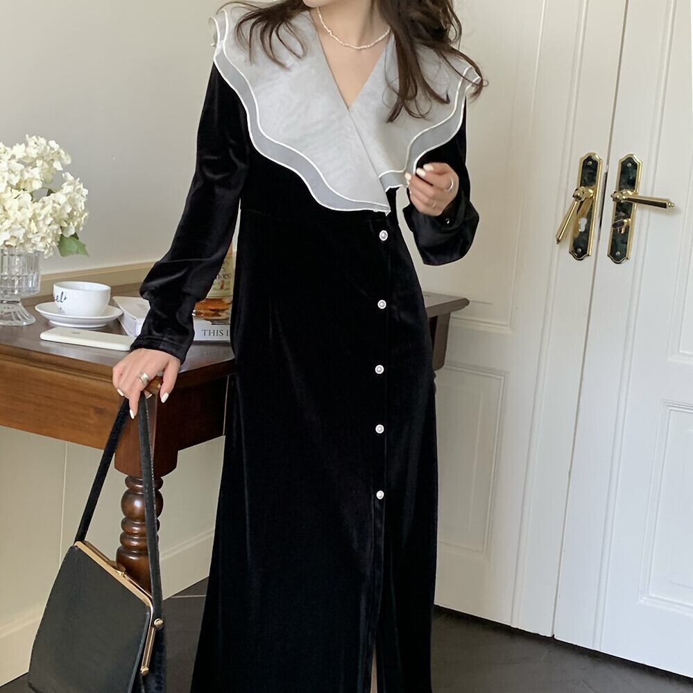 【送料無料】 ビッグカラー ベルベット調 ロング ワンピース 長袖 Vネック Aライン かわいい 大人可愛い きれいめ シンプル カジュアル 大人 上品 おしゃれ お洒落 かっこいい レトロ 大人可愛い 大人女子 こなれ感 ラフ ラブリー キュート ガーリー ルーズ 無地 春 秋 謝恩会 二次会 10代 20代 30代 レディース デート お出かけ 女子会 パーティー イベント 着回し 普段使い 重ね着 韓国系 オルチャン コーデ スタイル 楽ちん モテ 体系カバー 脚長 トレンド 流行 ロリータ