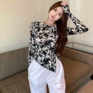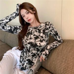 【送料無料】 トップス シャツ プルオーバー ショート ショート丈 長袖 ラウンドネック 大人可愛い カジュアル おしゃれ お洒落 かっこいい レトロ 個性的 主役級 存在感 柄 絞り染め 春 秋 10代 20代 30代 レディース 学生 通学 デート お出かけ 女子会 休日 着回し 普段使い 重ね着 韓国 韓国系 オルチャン ファッション コーデ スタイル 楽ちん 新作 トレンド 流行 インスタ映え S M L 黒 ブラック モノトーン