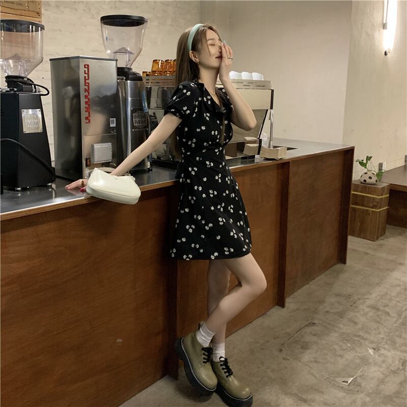【送料無料】 ワンピース 膝上 ミニ ショート ミニ丈 ショート丈 袖あり 半袖 パフスリーブ Vネック 襟なし Aライン ハイウエスト シフォン かわいい 大人可愛い カジュアル 大人 おしゃれ お洒落 大人女子 柄 花柄 小花柄 フラワー プリント 夏 10代 20代 レディース 学生 通学 デート お出かけ 女子会 休日 旅行 着回し 普段使い 重ね着 韓国 韓国系 オルチャン ファッション モテ S M 黒 ブラック