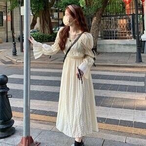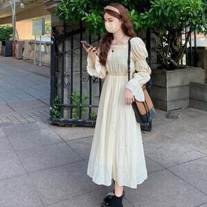 【送料無料】 ワンピース ワンピドレス 膝下 ミモレ ミモレ丈 袖あり 長袖 フレアスリーブ 襟なし スクエアネック フレア 切り替えデザイン リボン ハイウエスト かわいい 大人可愛い 大人 おしゃれ お洒落 大人女子 ラブリー キュート ガーリー 主役級 存在感 無地 春 秋 10代 20代 レディース 学生 通学 デート お出かけ 女子会 休日 パーティー イベント 旅行 着回し 普段使い 重ね着 韓国 韓国系 オルチャン ファッション フリーサイズ ワンサイズ アプリコット