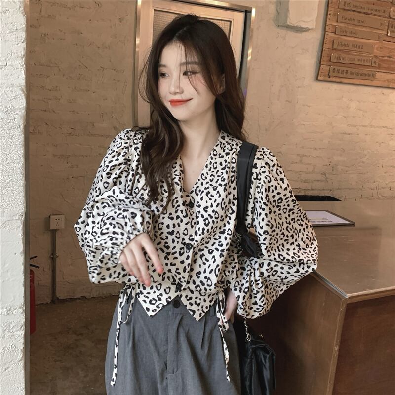 【送料無料】 トップス シャツ ブラウス Vネック ショート丈 ショート 袖あり 長袖 パフスリーブ 萌袖 襟なし リボン ウエストリボン かわいい 大人可愛い カジュアル 大人 おしゃれ お洒落 かっこいい 大人女子 こなれ感 ルーズ 個性的 クール 存在感 柄 ヒョウ柄 レオパード アニマル柄 春 秋 10代 20代 レディース 通勤 学生 通学 デート お出かけ 女子会 休日 旅行 着回し 普段使い 重ね着 韓国 韓国系 オルチャン ファッション ゆったり ゆる フリーサイズ ホワイト