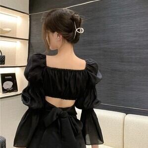 【送料無料】 トップス ブラウス バックリボン ショート ショート丈 袖あり 長袖 パフスリーブ 襟なし スクエアネック スリム 細身 切り替えデザイン リボン バックシャン バックコンシャス かわいい 大人可愛い きれいめ シンプル カジュアル 大人 上品 おしゃれ お洒落 大人女子 ラブリー キュート ガーリー 存在感 主役級 無地 春 秋 10代 20代 レディース 通勤 学生 通学 デート お出かけ 女子会 休日 着回し 普段使い 重ね着 韓国 オルチャン フリーサイズ 白 ホワイト 黒 ブラック