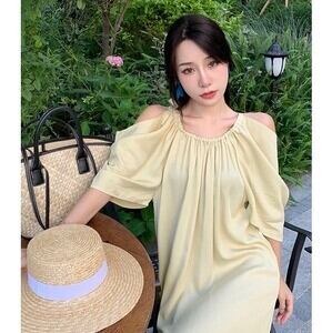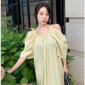 【送料無料】 ワンピース プルオーバー ロングスカート ロング ロング丈 袖あり 半袖 パフスリーブ ラウンドネック オフショルダー オフショル かわいい 大人可愛い きれいめ シンプル カジュアル おしゃれ お洒落 大人女子 こなれ感 ルーズ 主役級 存在感 無地 夏 10代 20代 30代 レディース 学生 通学 デート お出かけ 女子会 パーティー イベント リゾート 旅行 着回し 普段使い 韓国 韓国系 オルチャン ファッション ゆったり ゆる ワンサイズ 緑 グリーン