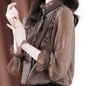 【送料無料】 レオパード スタンドカラー ブラウス フリル リボン パフスリーブ シャツ 長袖 ヒョウ柄 豹 かわいい 大人可愛い きれいめ シンプル カジュアル 大人 上品 おしゃれ お洒落 かっこいい 大人可愛い 大人女子 こなれ感 ラフ キュート ガーリー ルーズ 春 秋 10代 20代 30代 レディース 学生 デート お出かけ 女子会 お泊まり 着回し 普段使い 重ね着 韓国系 オルチャン ファッション コーデ スタイル モテ 体系カバー 脚長 トレンド 流行 インスタ映え