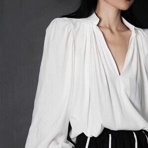 ボリュームのある袖がコーデのポイントになるVネックシャツです。