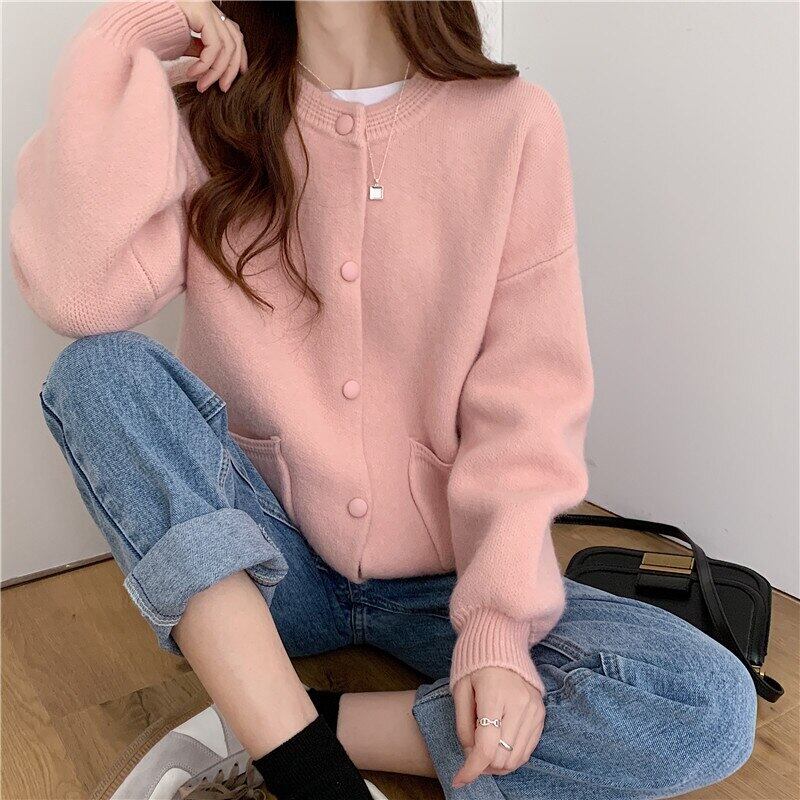 【送料無料】 トップス ニット カーディガン ショート ショート丈 クロップ丈 スナップボタン 袖あり 長袖 襟なし ラウンドネック 前開き かわいい 大人可愛い きれいめ シンプル カジュアル 大人 上品 おしゃれ お洒落 大人女子 ルーズ 柄 春 秋 10代 20代 レディース 学生 通学 デート お出かけ 女子会 休日 旅行 着回し 普段使い 重ね着 韓国 韓国系 オルチャン ファッション スタイル コーデ ゆったり ゆる 大きいサイズ S M L ホワイト ピンク
