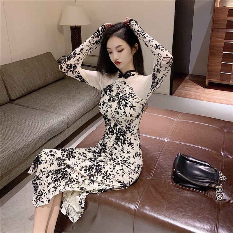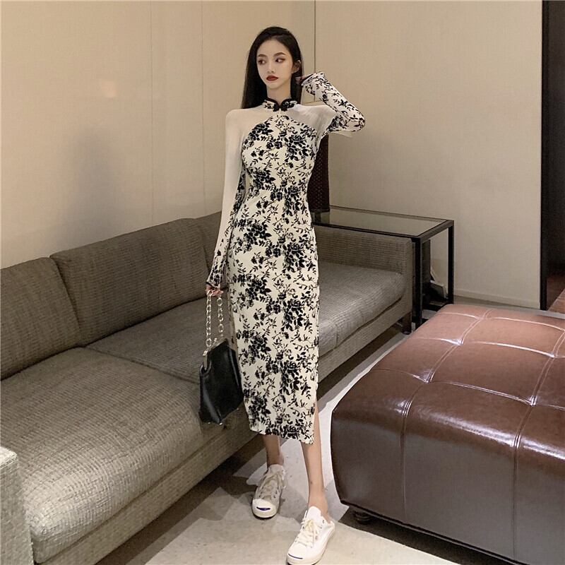 【送料無料】 ワンピース プルオーバー ロング ミモレ丈 袖あり 長袖 シアー メッシュ 切り替え 花柄 フラワー モノトーン チャイナドレス ベスト ハイウエスト パフスリーブ かわいい 大人可愛い きれいめ シンプル カジュアル おしゃれ お洒落 大人女子 こなれ感 ルーズ 主役級 存在感 無地 春 夏 10代 20代 30代 レディース 学生 通学 デート お出かけ 女子会 パーティー イベント リゾート 旅行 着回し 普段使い 韓国系 オルチャン ゆったり ゆる ブラック ホワイト S M L