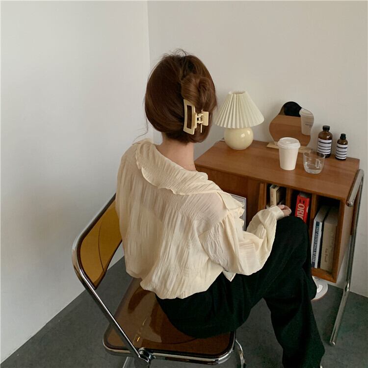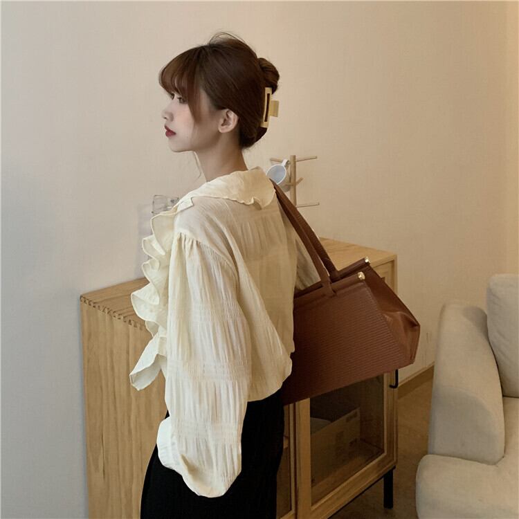 【送料無料】 シャツ トップス ノーカラー ランタンスリーブ シャーリング ブラウス 長袖 ボリューム袖 襟フリル かわいい 大人可愛い きれいめ シンプル カジュアル 大人 上品 おしゃれ お洒落 かっこいい 大人可愛い 大人女子 こなれ感 ラフ キュート ガーリー ルーズ 無地 オールシーズン 10代 20代 レディース 学生 通学 デート お出かけ 女子会 お泊まり 着回し 普段使い 重ね着 韓国系 ファッション コーデ スタイル トレンド 流行 インスタ映え アプリコット ホワイト パフスリーブ