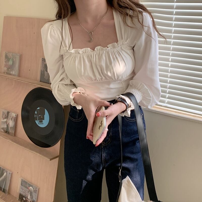 【送料無料】 トップス ブラウス ショート丈 長袖 ギンガムチェック パフスリーブ スクエアネック シャーリング スリム クロップ丈 ボタン かわいい 大人可愛い きれいめ おしゃれ お洒落 こなれ感 ラブリー キュート ガーリー 主役級 存在感 夏 10代 20代 レディース 学生 通学 デート お出かけ 女子会 レストラン 着回し 普段使い 韓国 韓国系 オルチャン ファッション コーデ スタイル モテ トレンド 流行 インスタ映え ワンサイズ 色展開 ブラック ホワイト