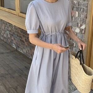【送料無料】 ワンピース ミモレ丈 ロング丈 半袖 パフスリーブ ギャザー ドローストリング ハイウエスト クルーネック Aライン かわいい 大人可愛い きれいめ シンプル カジュアル 大人 上品 おしゃれ お洒落 かっこいい 大人可愛い 大人女子 こなれ感 キュート ガーリー ルーズ 無地 春 夏 10代 20代 30代 オフィス ビジネス OL 通勤 学生 通学 デート お出かけ 女子会 お泊まり 休日 着回し 普段使い 重ね着 韓国系 コーデ スタイル モテ 体型カバー 脚長 トレンド 流行