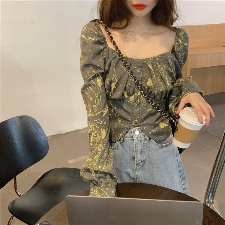 【送料無料】 トップス ブラウス ショート ショート丈 袖あり 長袖 パフスリーブ スクエアネック かわいい 大人可愛い きれいめ 大人 おしゃれ お洒落 大人女子 こなれ感 個性的 セクシー 主役級 存在感 柄 プリント 春 秋 10代 20代 レディース 学生 通学 デート お出かけ 公園デビュー 休日 着回し 普段使い 韓国 韓国系 オルチャン ファッション コーデ スタイル モテ トレンド 流行 インスタ映え ワンサイズ フリーサイズ 色展開 白 ホワイト 緑 グリーン