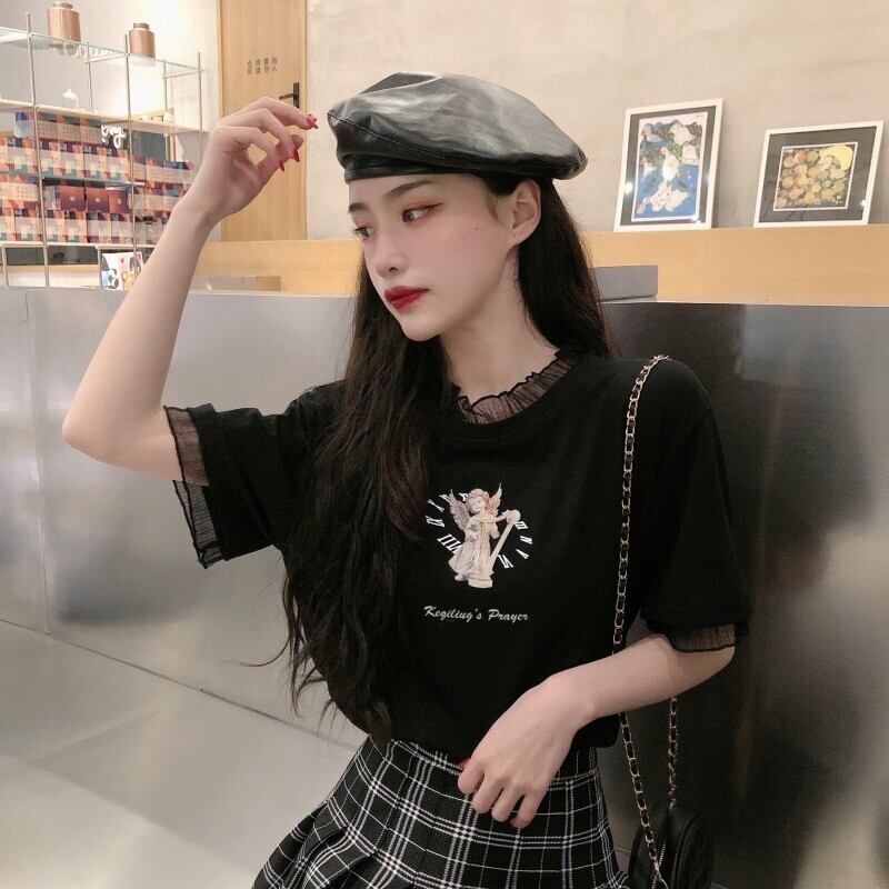 【送料無料】 トップス カットソー Tシャツ 袖あり 半袖 ハイネック フリル レース レイヤード チュール かわいい 大人可愛い ゴシック 天使 エンジェル カジュアル おしゃれ お洒落 ストリート キュート ガーリー 無地 春 夏 10代 20代 30代 レディース 女性用 学生 通学 デート お出かけ 女子会 休日 韓国 韓国系 ファッション モテ S M L XL ブラック レッド