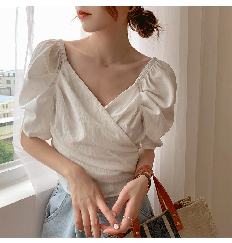【送料無料】 トップス シャツ ブラウス ショート丈 半袖 パフスリーブ Vネック バックリボン かわいい 大人可愛い きれいめ 大人 上品 おしゃれ お洒落 大人女子 こなれ感 ラブリー キュート 個性的 主役級 存在感 無地 夏 10代 20代 30代 レディース オフィス OL 通勤 学生 通学 デート お出かけ 休日 着回し 普段使い 重ね着 韓国 韓国系 オルチャン ファッション コーデ スタイル モテ 定番 トレンド 流行 S M L 色展開 白 ホワイト カーキ