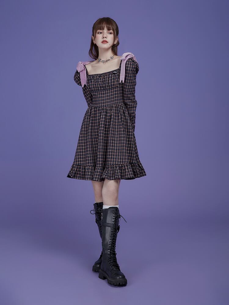 【送料無料】 ワンピース ショート ショート丈 ミニ ミニ丈 膝上 長袖 チェック パフスリーブ スクエアネック フリル リボン ハイウエスト かわいい 大人可愛い きれいめ 上品 おしゃれ お洒落 こなれ感 ラブリー キュート ガーリー 主役級 存在感 柄 春 秋 10代 20代 レディース 学生 通学 デート お出かけ 公園デビュー 女子会 休日 旅行 着回し 普段使い 重ね着 韓国 韓国系 オルチャン ファッション コーデ スタイル モテ トレンド 流行 インスタ映え S M L ブラウン系