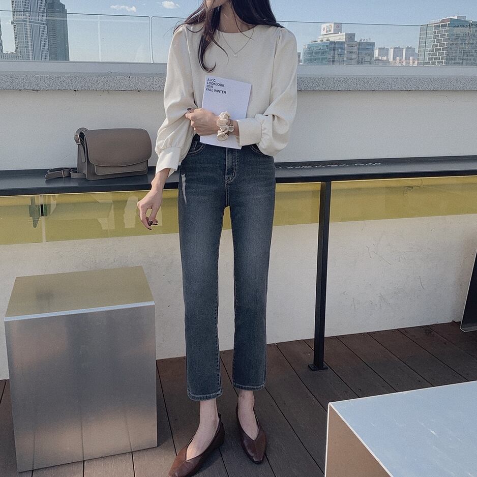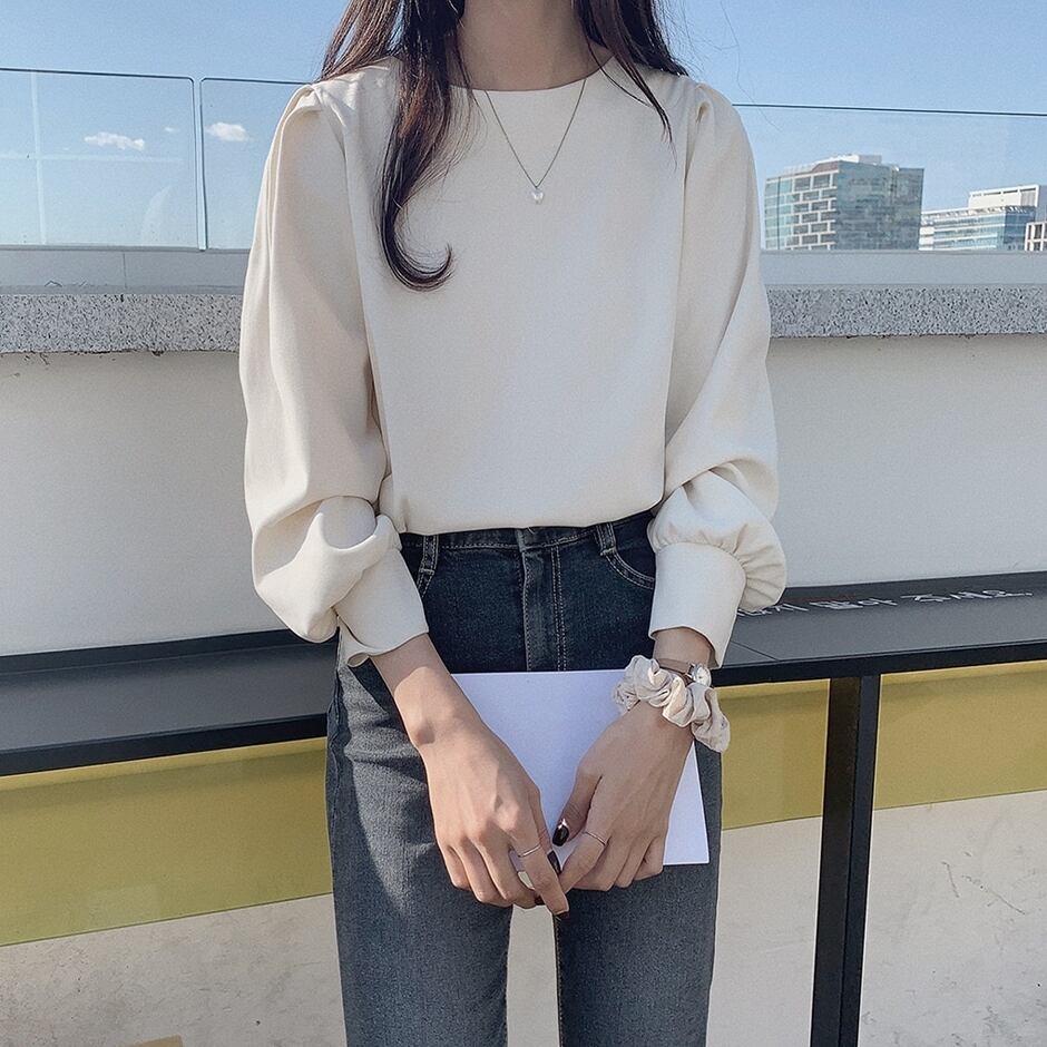 ノーカラーとタック入りパフスリーブでレトロな上品さをまとうブラウスです。