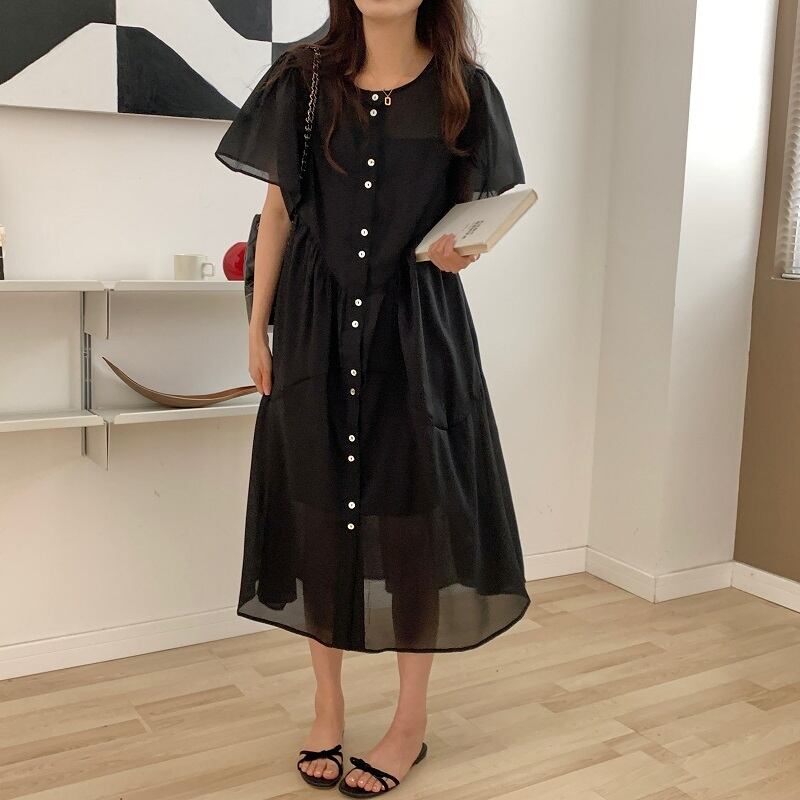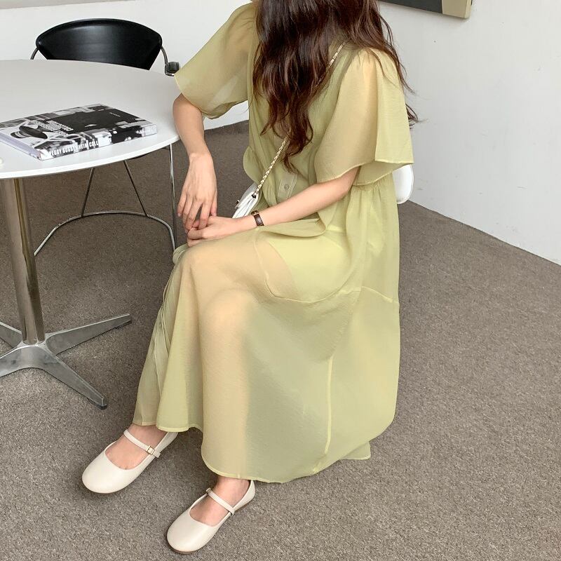 【送料無料】 ワンピース ロング ロング丈 袖あり 半袖 ラウンドネック 襟なし フレア シフォン 透け感 シースルー かわいい 大人可愛い きれいめ カジュアル 上品 おしゃれ お洒落 大人女子 こなれ感 キュート エレガント 主役級 存在感 無地 夏 10代 20代 レディース 学生 通学 デート お出かけ 女子会 リゾート 旅行 着回し 普段使い 重ね着 韓国 韓国系 オルチャン ファッション コーデ スタイル モテ 体系カバー ワンサイズ フリーサイズ 色展開 黒 ブラック イエロー
