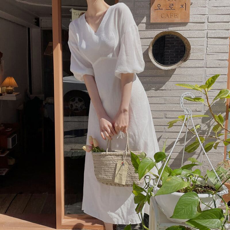 【送料無料】 ワンピース ロング ロング丈 袖あり 半袖 パフスリーブ Vネック ハイウエスト かわいい 大人可愛い きれいめ シンプル 大人 上品 おしゃれ お洒落 大人女子 こなれ感 キュート ガーリー エレガント 主役級 存在感 無地 夏 10代 20代 30代 レディース 女性用 学生 通学 デート お出かけ 女子会 リゾート 旅行 着回し 普段使い 韓国 韓国系 オルチャン ファッション コーデ スタイル モテ トレンド 流行 ワンサイズ フリーサイズ 色展開 白 ホワイト 青 ブルー