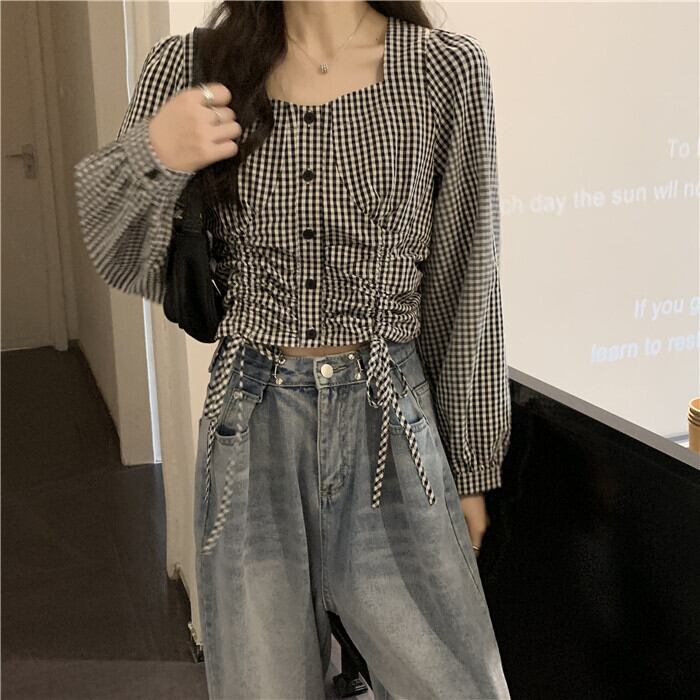 【送料無料】 ダブルギャザー ブラウス 長袖 スクエアネック リボン ショート丈 モノトーン ホワイト ブラック チェック柄 かわいい 大人可愛い きれいめ シンプル カジュアル 大人 上品 おしゃれ お洒落 かっこいい 大人可愛い 大人女子 こなれ感 ラフ キュート ガーリー 春 夏 秋 10代 20代 30代 40代 レディース 学生 通学 デート お出かけ 女子会 お泊まり 休日 着回し 普段使い 重ね着 韓国系 オルチャン コーデ スタイル モテ 体系カバー 脚長 トレンド 流行 インスタ映え
