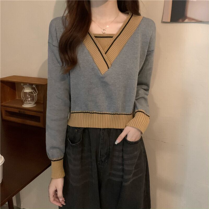 【送料無料】 トップス ニットソー セーター ショート ショート丈 袖あり 長袖 Vネック かわいい 大人可愛い きれいめ カジュアル おしゃれ お洒落 レトロ 大人女子 こなれ感 ラブリー キュート 個性的 主役級 存在感 無地 春 秋 10代 20代 30代 レディース 学生 通学 デート お出かけ 女子会 休日 着回し 普段使い 韓国 韓国系 オルチャン ファッション コーデ スタイル ゆったり ゆる ワンサイズ フリーサイズ 色展開 黒 ブラック 灰色 グレー ベージュ ネイビー バイカラー