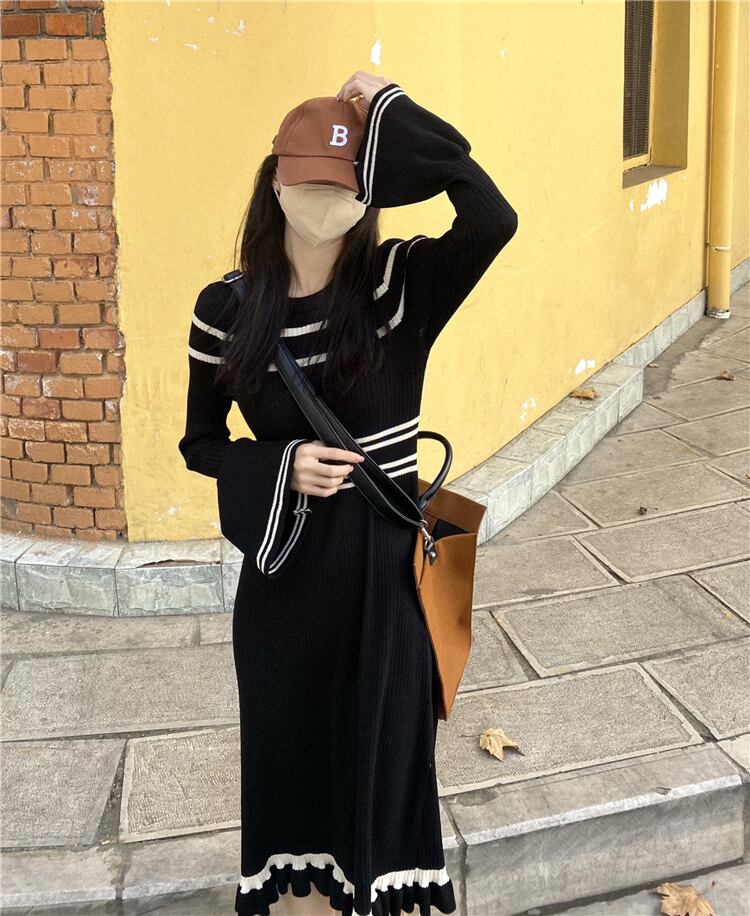 【送料無料】 ワンピース ニットワンピース ロング ロング丈 袖あり 長袖 ラウンドネック フレア ハイウエスト リブ ニット かわいい 大人可愛い きれいめ カジュアル おしゃれ お洒落 大人女子 こなれ感 ラブリー キュート 個性的 主役級 存在感 無地 春 秋 10代 20代 30代 レディース 学生 通学 デート お出かけ 女子会 休日 着回し 普段使い 韓国 韓国系 オルチャン ファッション コーデ スタイル モテ ワンサイズ フリーサイズ 色展開 白 ホワイト 黒 ブラック