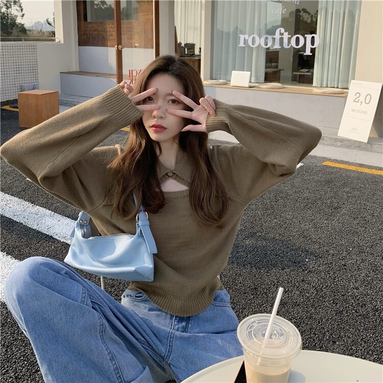 【送料無料】 ニット セーター ラウンドネック フェイクレイヤード 襟付き カットアウト トップス セーター 長袖 かわいい 大人可愛い きれいめ シンプル カジュアル 大人 上品 おしゃれ お洒落 大人女子 ラブリー キュート モダン 抜け感 春 秋 10代 20代 30代 40代 レディース ママ オフィス ビジネス OL 通勤 デート お出かけ 休日 着回し 普段使い 韓国系 オルチャン コーデ スタイル 体型カバー インスタ映え ゆったり M L XL 2XL 3XLブラウン ブラック