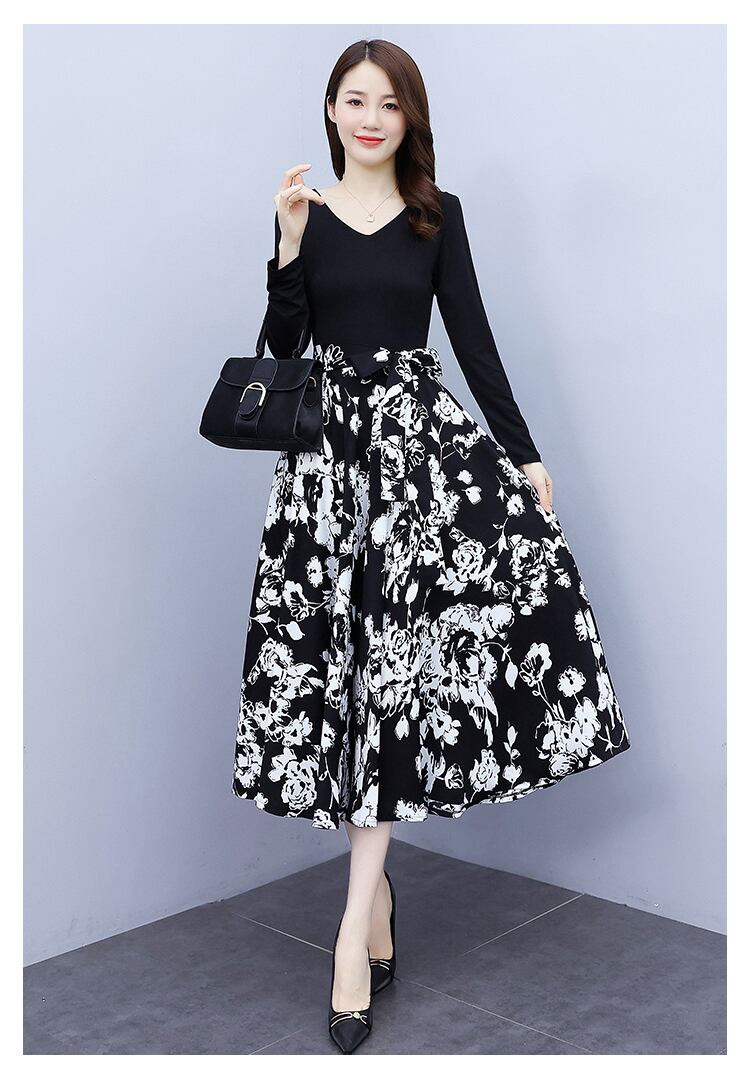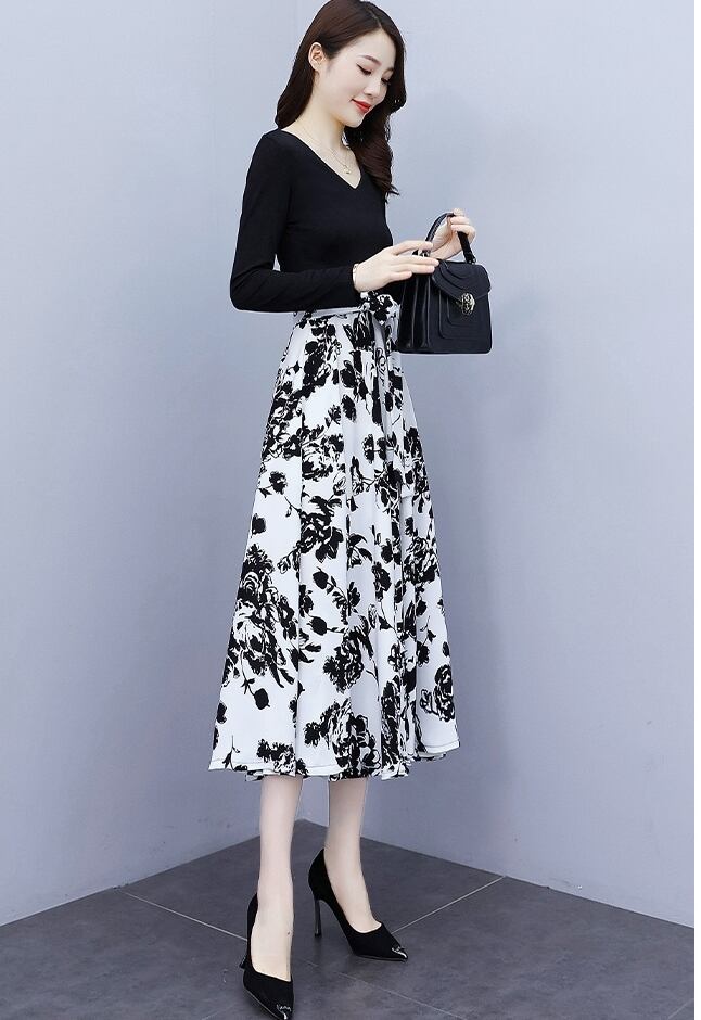 【送料無料】 ワンピース 膝下 ミモレ丈 ロング丈 長袖 Vネック 透け感 花柄 バイカラー ベルト付き ハイウエスト かわいい 大人可愛い きれいめ 大人 上品 おしゃれ お洒落 大人女子 こなれ感 ラブリー エレガント 主役級 存在感 柄 小花柄 フラワー 春 秋 10代 20代 30代 レディース OL 学生 通学 デート お出かけ 女子会 休日 ガーデン レストラン 着回し 普段使い 韓国系 コーデ スタイル モテ トレンド 流行 インスタ映え M L XL 2 XL 3XL ホワイト ブラック