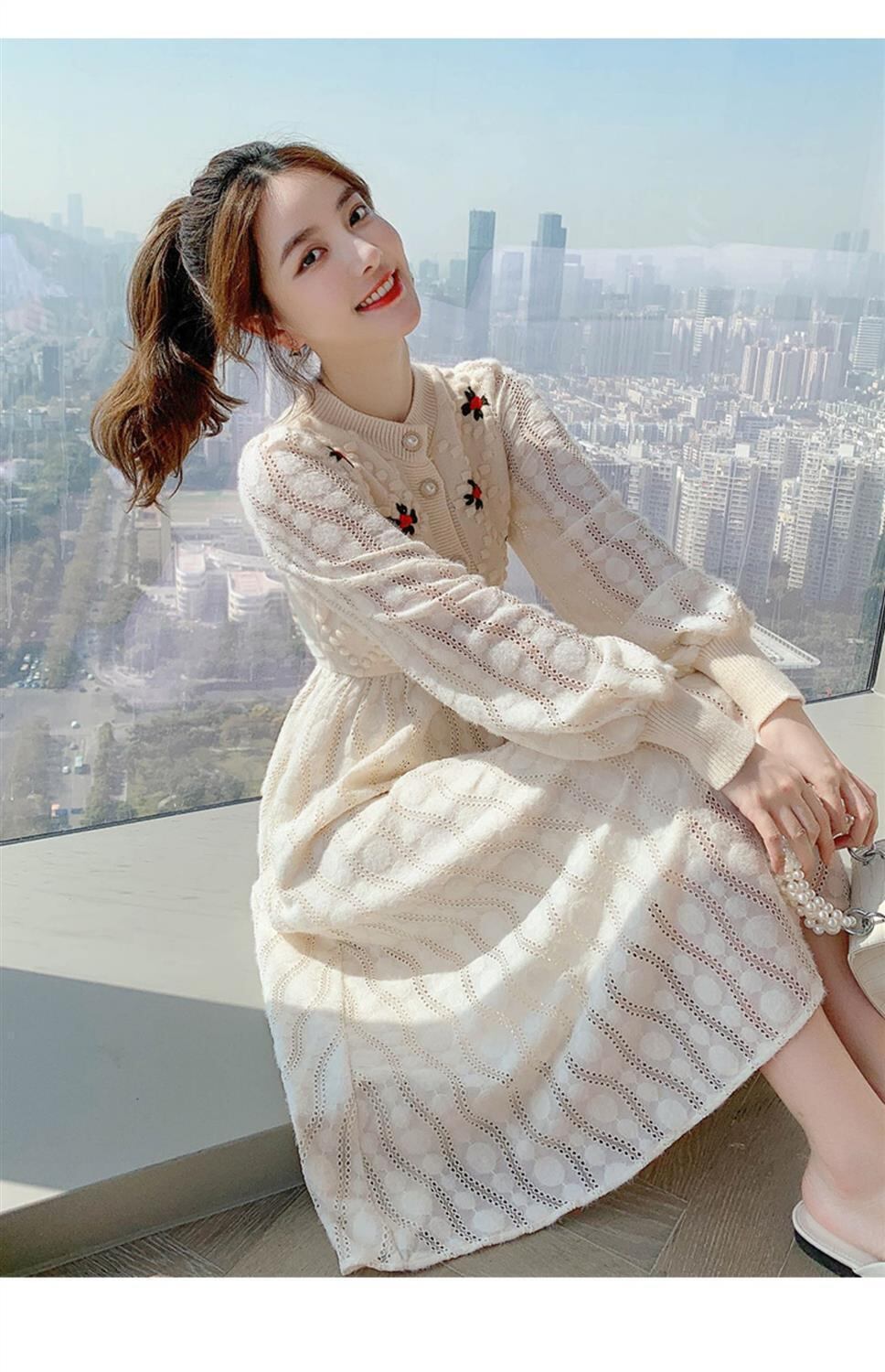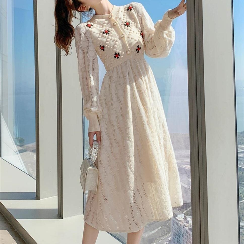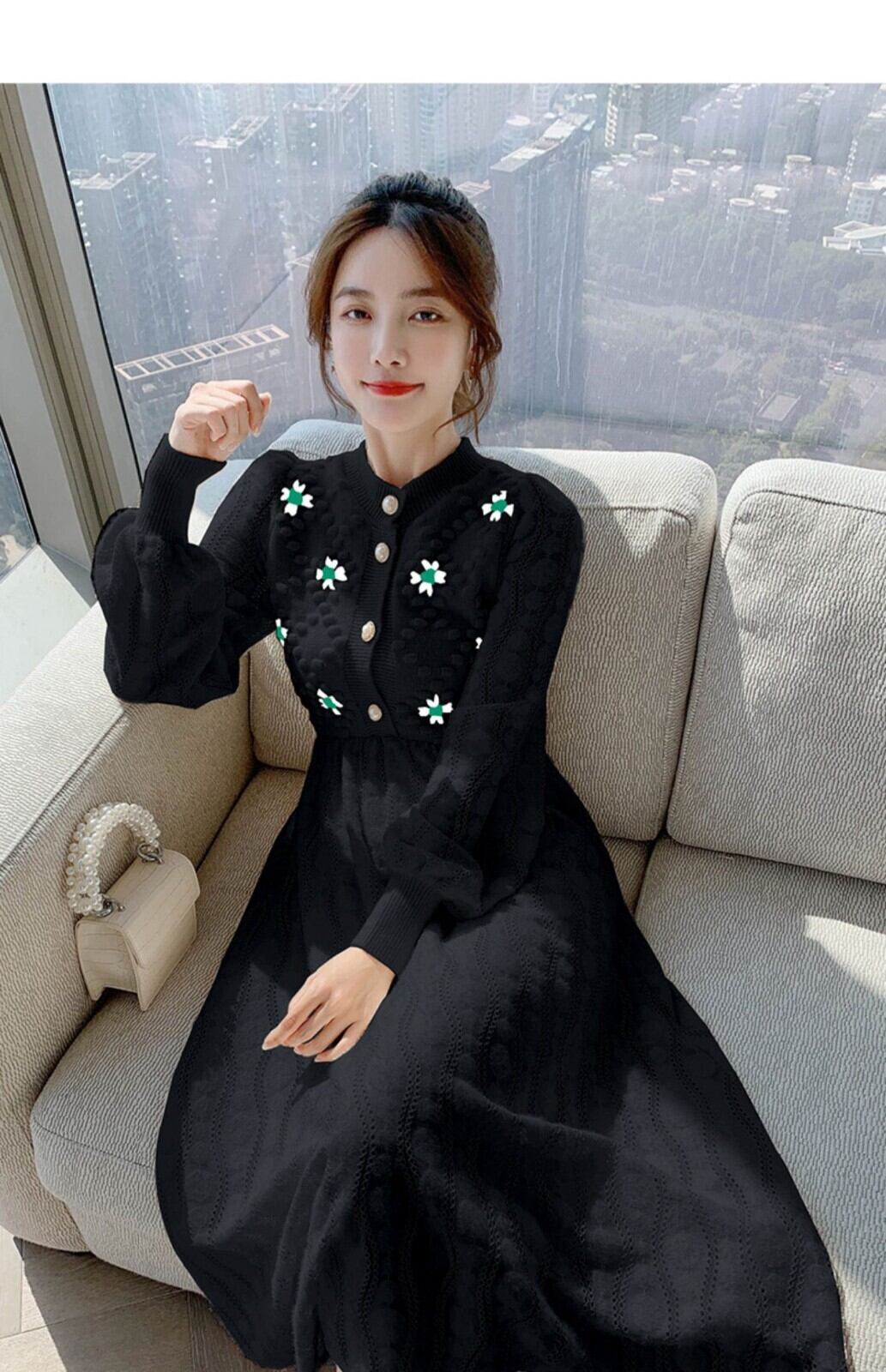 【送料無料】 ワンピース ニット 切り替え 花柄 パールボタン ミモレ丈 長袖 パフスリーブ フリル ケーブル編み ハイウエスト クルーネック Aライン かわいい 大人可愛い きれいめ シンプル カジュアル 大人 上品 おしゃれ お洒落 かっこいい 大人女子 こなれ感 キュート ガーリー ルーズ 無地 春 秋 10代 20代 30代 レディース ビジネス OL 通勤 デート お出かけ 女子会 着普段使い 重ね着 韓国系 コーデ スタイル 体型カバー トレンド S M L XL ブラック ベージュ