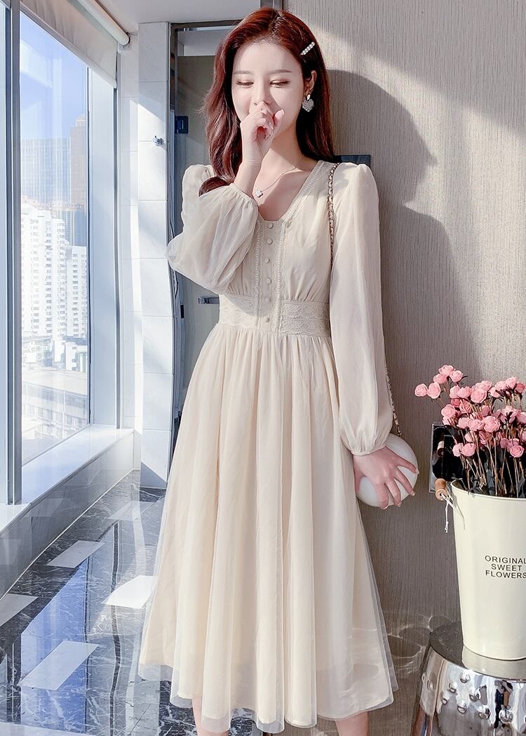 【送料無料】 ワンピース シフォン ドレス シアー Vネック 長袖 クルミボタン パフスリーブ ミモレ丈 二次会 パーティー ハイウエスト かわいい 大人可愛い きれいめ シンプル カジュアル 大人 上品 おしゃれ お洒落 かっこいい 大人可愛い 大人女子 こなれ感 ラフ キュート ガーリー ルーズ 春 夏 10代 20代 30代 レディース デート お出かけ 女子会 お泊まり 着回し 普段使い 重ね着 韓国系 コーデ スタイル モテ 体型カバー 脚長 トレンド 流行 インスタ映え アプリコット