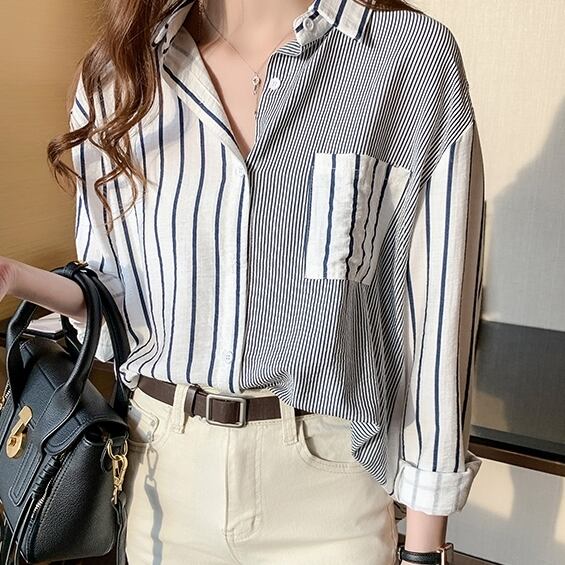 【送料無料】 トップス シャツ ブラウス 長袖 襟付き 大人可愛い 切り替え アシンメトリー きれいめ シンプル カジュアル 上品 おしゃれ お洒落 大人女子 こなれ感 クール セクシー エレガント 主役級 存在感 ストライプ 春 夏 秋 発表会 演奏会 お呼ばれ 20代 30代 40代 レディース ビジネス OL 通勤 学生 通学 デート お出かけ 休日 着回し 普段使い 重ね着 韓国 韓国系 オルチャン コーデ 楽ちん モテ S M L XL 2XL 大きいサイズ ゆったり ゆる ブルー オレンジ