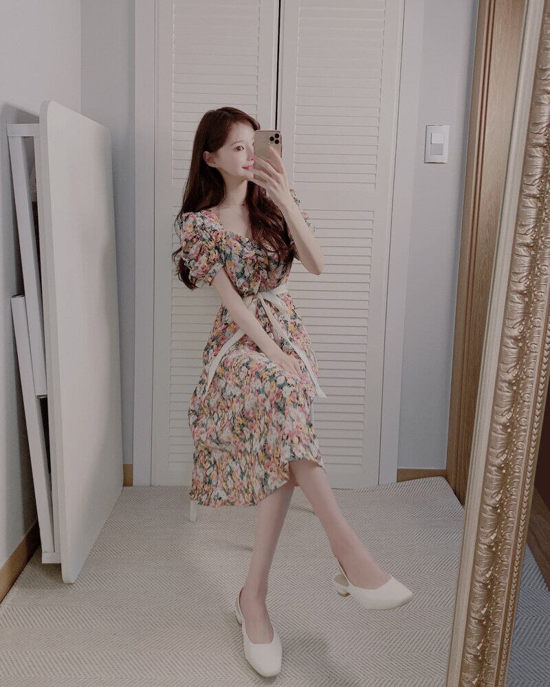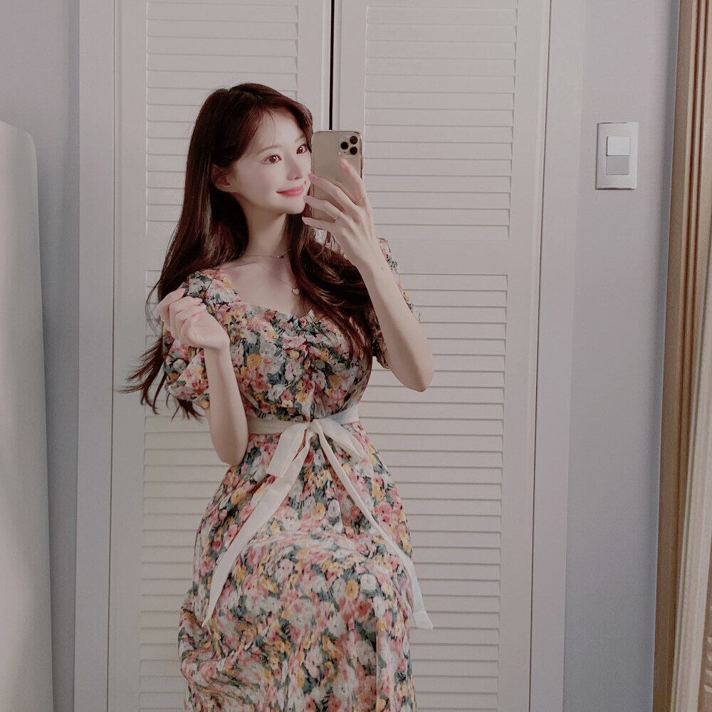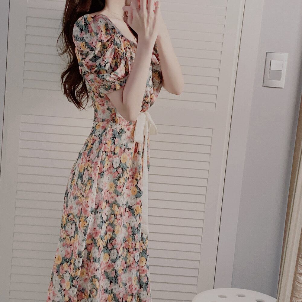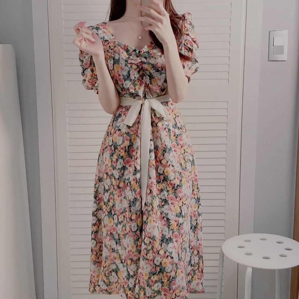 【送料無料】 ワンピース 膝丈 ひざ丈 ミモレ ミモレ丈 袖あり 半袖 パフスリーブ Vネック スクエアネック Aライン リボン ウエストリボン ハイウエスト かわいい 大人可愛い きれいめ おしゃれ お洒落 大人女子 こなれ感 ラブリー キュート 個性的 エレガント 主役級 存在感 柄 花柄 小花柄 フラワー 夏 10代 20代 レディース 学生 通学 デート お出かけ 女子会 旅行 着回し 普段使い 韓国 韓国系 オルチャン コーデ スタイル M L XL 2XL 3XL 4XL 大きいサイズ