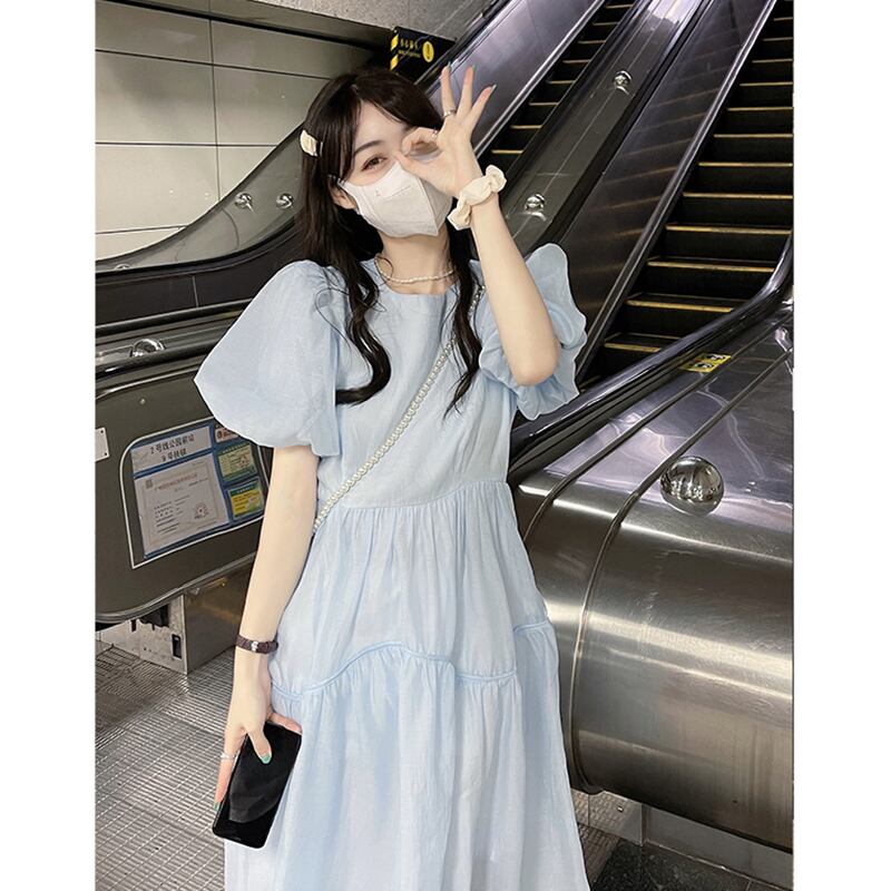 【送料無料】ワンピース ドレスミモレ丈 半袖 ラウンドネック 透け感 シフォン ハイウエスト アシンメトリー フレア パフスリーブ ギャザー スリーブ 細身 ハイウエスト きれいめ おしゃれ お洒落 クール セクシー 主役級 存在感 無地 夏 お呼ばれ 10代 20代 レディース デート お出かけ 休日 パーティー イベント 着回し 普段使い 韓国 韓国系 オルチャン ファッション コーデ スタイル モテ 美脚 脚長 新作 定番 トレンド 流行 S M ライトブルー