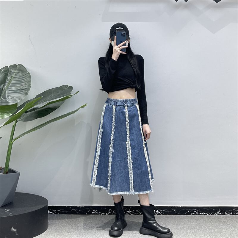 【送料無料】スカート ボトムス デニムスカート ミドル丈 ミモレ丈 フレアスカート カットオフ ハイウエスト かわいい 大人可愛い カジュアル おしゃれ お洒落 かっこいい こなれ感 ラフ 個性的 主役級 存在感 無地 春 夏 10代 20代 レディース 学生 通学 デート お出かけ 女子会 休日 着回し 普段使い 韓国 韓国系 オルチャン ファッション コーデ スタイル ダメージ 体型カバー 美脚 脚長 定番 トレンド 流行 インスタ映え S M L XL 2XL ブルー