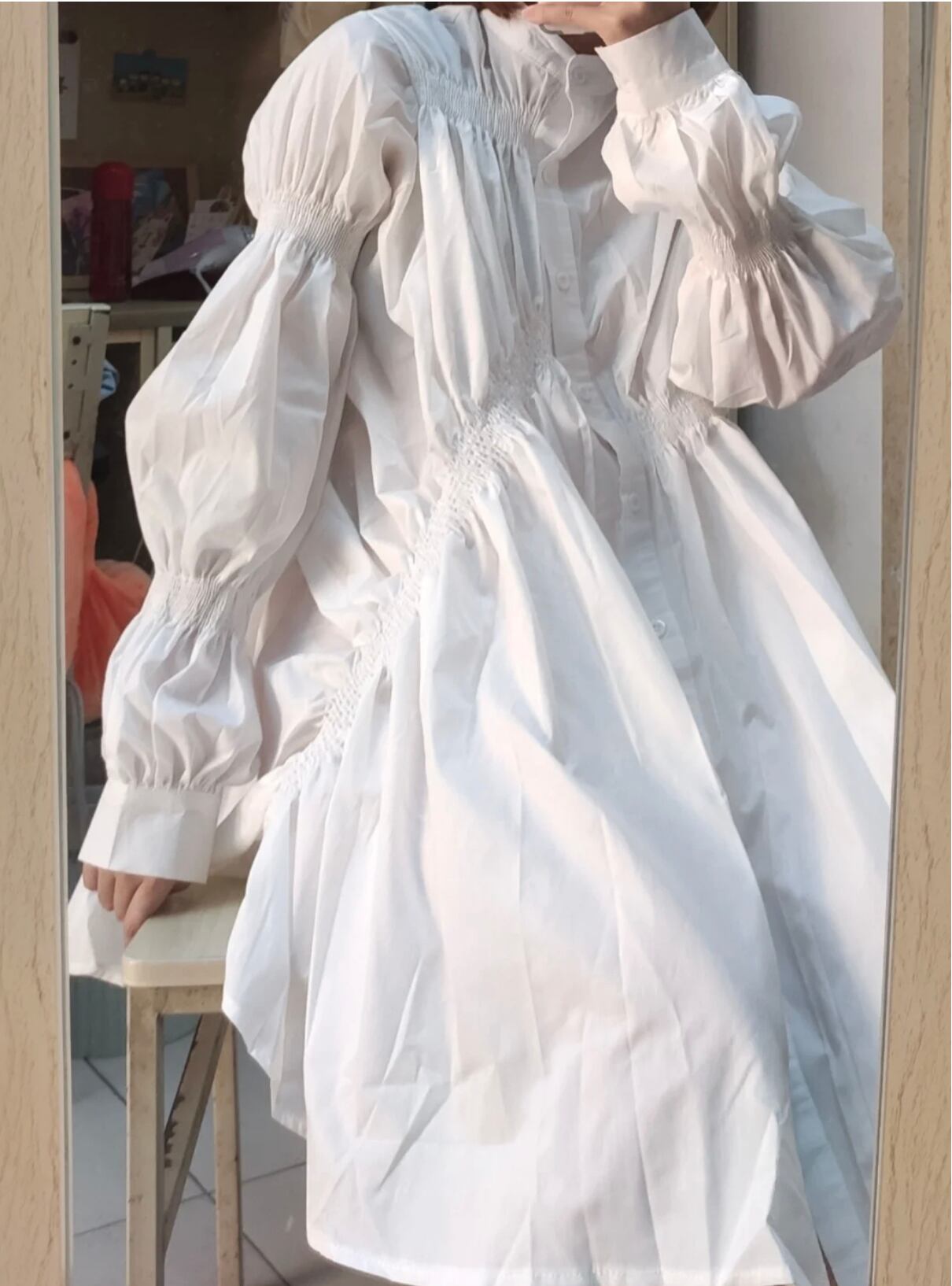 不規則なシャーリングのシャツワンピは個性的でおしゃれのポイントになります。