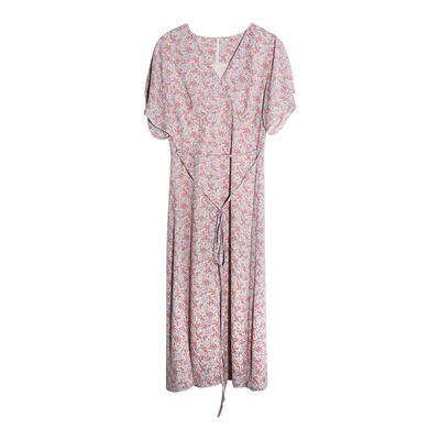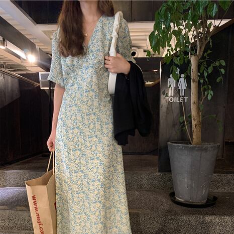 【送料無料】 ワンピース フラワー Vネック フローラル ハイウエスト ウエストリボン 半袖 ロング丈 小花柄 かわいい 大人可愛い きれいめ シンプル カジュアル 大人 上品 おしゃれ お洒落 かっこいい 大人可愛い 大人女子 こなれ感 ラフ キュート ガーリー ルーズ 20代 30代 40代 レディース デート お出かけ 女子会 お泊まり 休日 着回し 普段使い 重ね着 韓国系 オルチャン ファッション コーデ スタイル モテ 体系カバー 脚長 トレンド 流行 インスタ映え