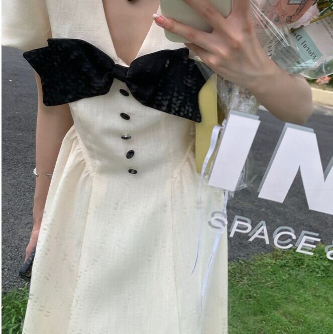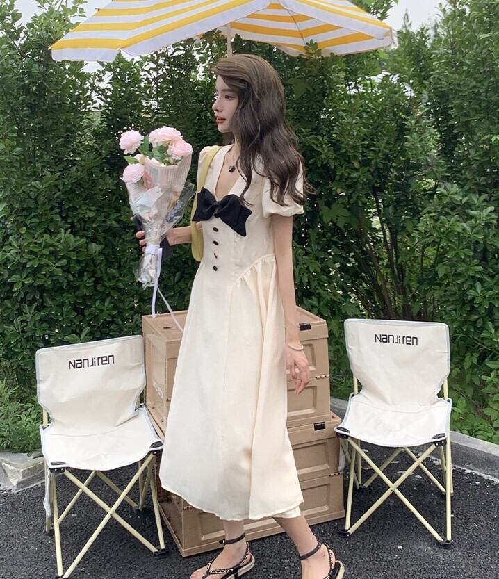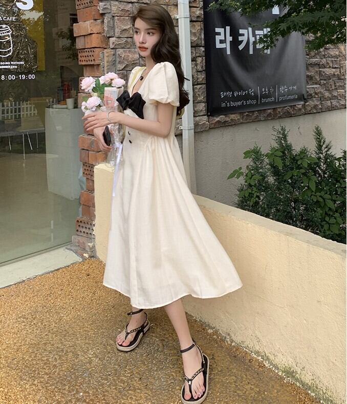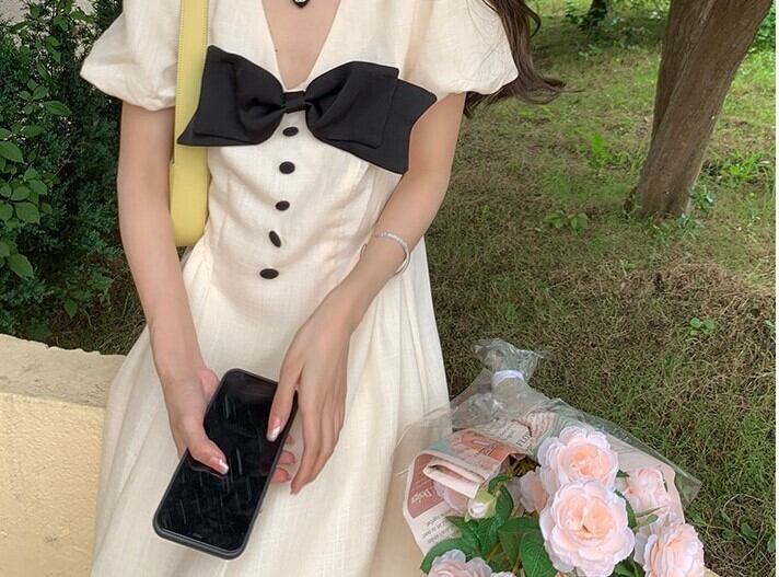 【送料無料】 ワンピース ミモレ ミモレ丈 ミドル丈 パフスリーブ Vネック Aライン リボン ハイウエスト 肌見せ かわいい 大人可愛い きれいめ おしゃれ お洒落 大人女子 こなれ感 ラブリー キュート ガーリー 主役級 存在感 無地 夏 発表会 演奏会 10代 20代 レディース 学生 通学 デート お出かけ 女子会 休日 パーティー レストラン 着回し 普段使い 韓国 韓国系 オルチャン ファッション コーデ スタイル モテ 体系カバー トレンド 流行 インスタ映え S M L 白 ホワイト