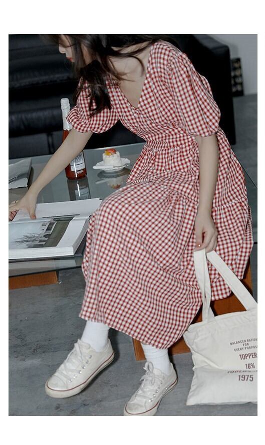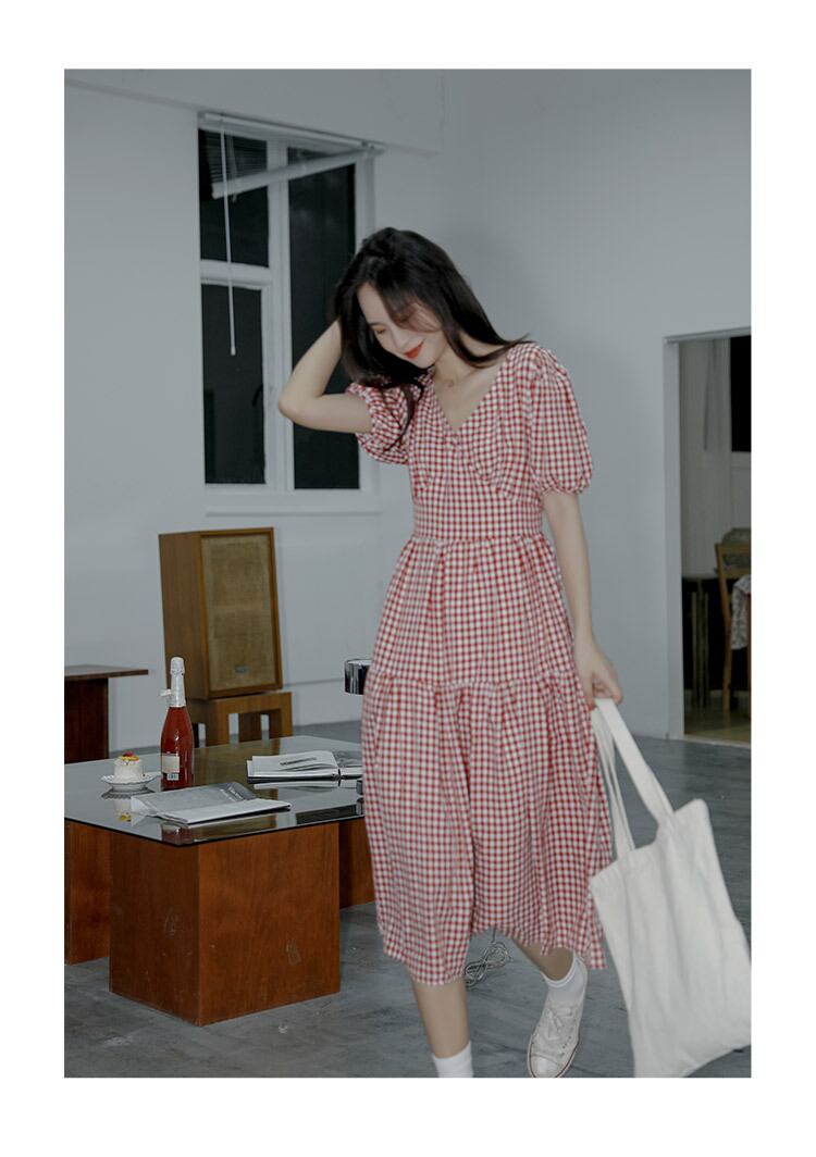 【送料無料】 ワンピース ミモレ ミモレ丈 半袖 パフスリーブ Vネック かわいい 大人可愛い きれいめ 上品 おしゃれ お洒落 大人女子 こなれ感 ラブリー キュート ガーリー 主役級 存在感 フェミニン 柄 チェック柄 夏 10代 20代 女の子 学生 通学 デート お出かけ 女子会 旅行 ガーデン レストラン 着回し 普段使い お揃い 双子 韓国 韓国系 オルチャン ファッション コーデ スタイル モテ トレンド 流行 インスタ映え S M L 色展開 赤 レッド