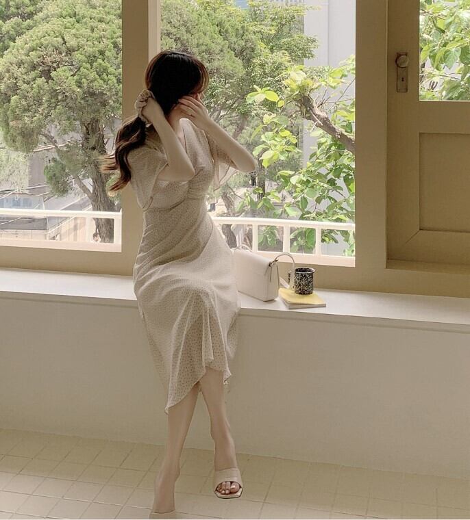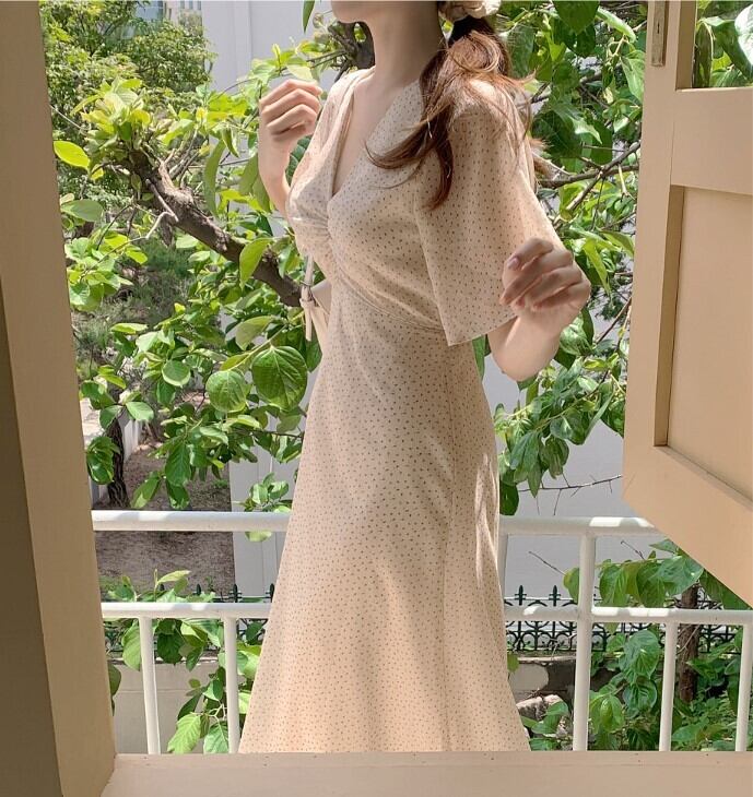 【送料無料】 ワンピース ミドル丈 半袖 パフスリーブ Vネック シフォン かわいい 大人可愛い きれいめ 上品 おしゃれ お洒落 大人女子 こなれ感 ラブリー キュート 主役級 存在感 フェミニン 柄 小花柄 夏 10代 20代 女の子 学生 通学 デート お出かけ 女子会 休日 リゾート 旅行 ガーデン レストラン 着回し 普段使い お揃い 双子 韓国 韓国系 オルチャン ファッション コーデ スタイル モテ トレンド 流行 インスタ映え S M L XL アプリコット