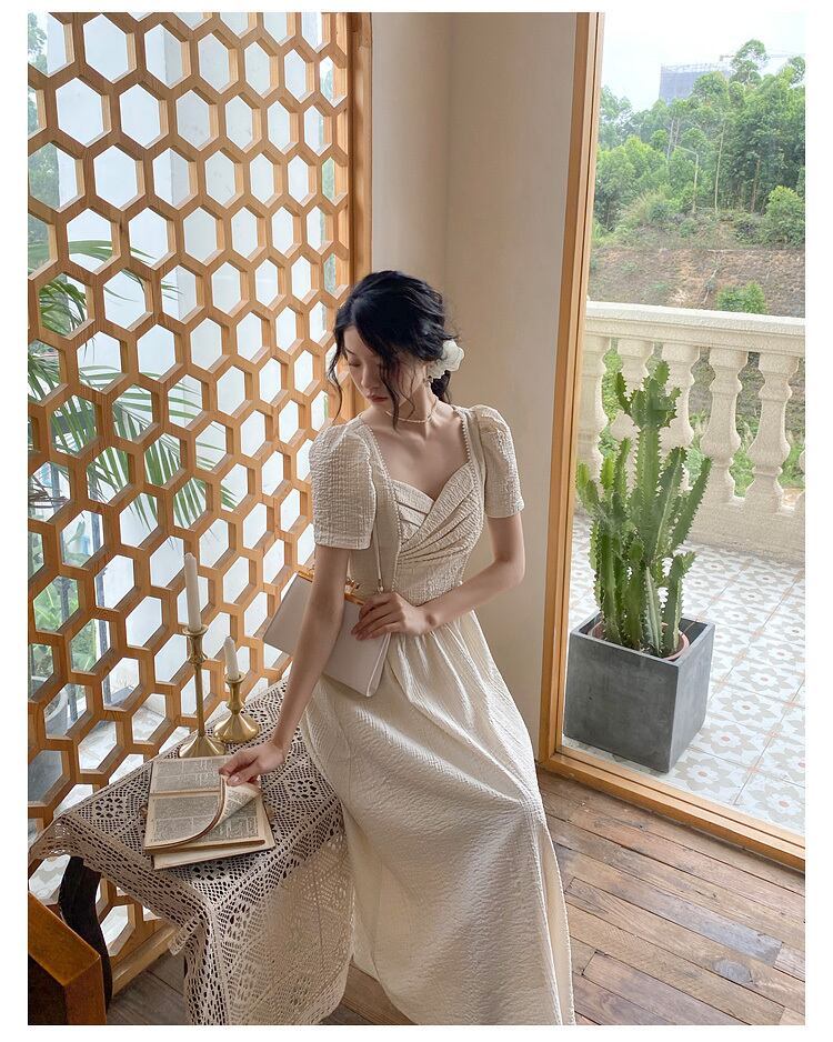 【送料無料】 ワンピース ドレス パーティードレス ロング ロング丈 袖あり 半袖 パフスリーブ スクエアネック Aライン ハイウエスト パール きれいめ 大人 上品 おしゃれ お洒落 エレガント 主役級 存在感 夏 誕生日 二次会 発表会 演奏会 お呼ばれ 20代 30代 40代 レディース 女性用 パーティー イベント ガーデン レストラン 韓国 韓国系 オルチャン ファッション コーデ スタイル モテ 美脚 脚長 新作 トレンド 流行 インスタ映え S M L アプリコット