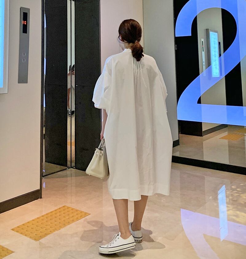 【送料無料】ワンピース 七分袖 パフスリーブ バルーンスリーブ スタンドカラー シャツワンピ ひざ丈 フレア ミニワンピ ホワイト ピンタック かわいい 大人可愛い きれいめ シンプル カジュアル 大人 上品 おしゃれ お洒落 かっこいい 大人可愛い 大人女子 こなれ感 ラフ キュート ガーリー ルーズ 10代 20代 レディース デート お出かけ 女子会 お泊まり 休日 着回し 普段使い 重ね着 韓国系 オルチャン ファッション コーデ スタイル モテ 体系カバー 脚長 トレンド 流行 インスタ映え