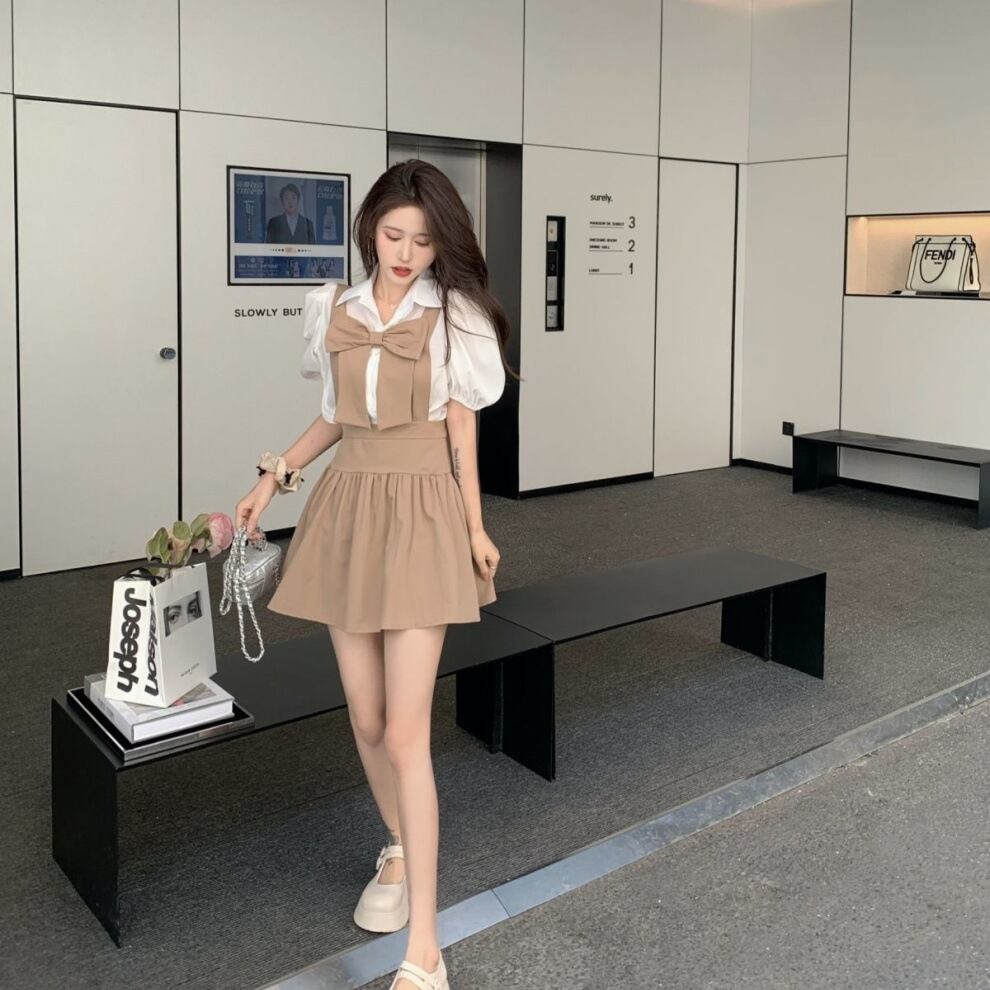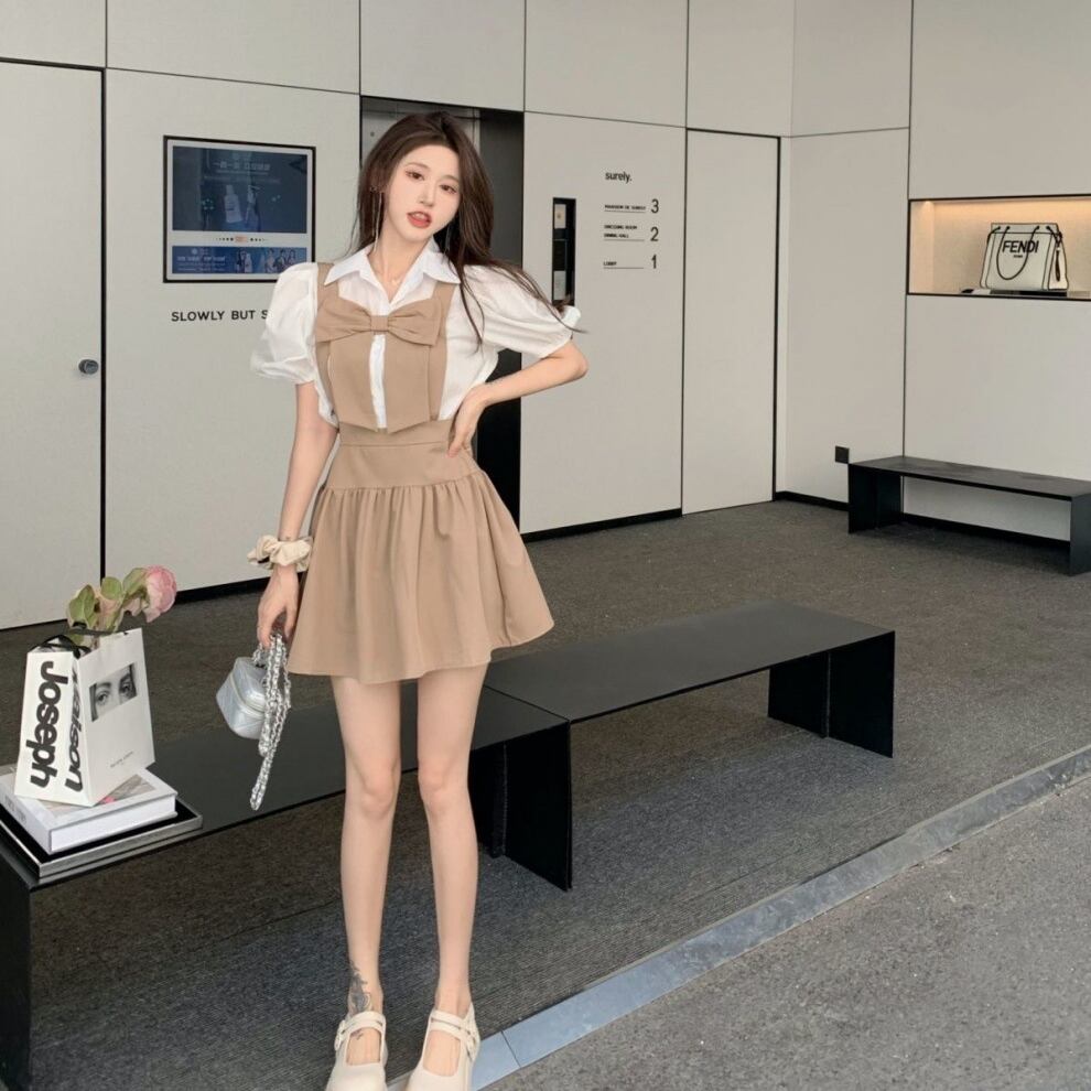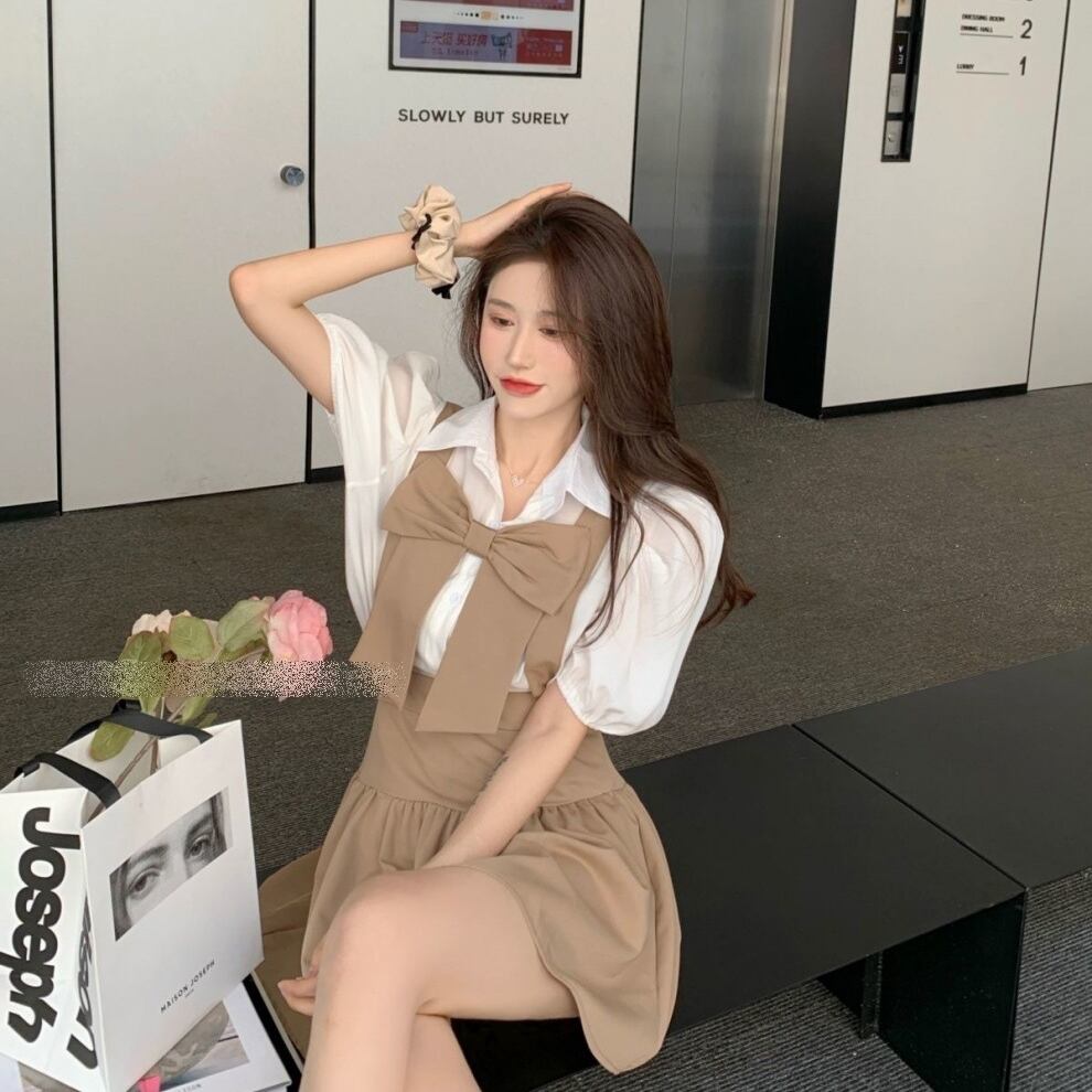 【送料無料】セットアップ トップス スカート 白シャツ ミニスカート サスペンダースカート ジャンパースカート ミニ ミニ丈 ハイウエスト ショート ショート丈 半袖 上下セット 2点セット ツーピース お得 かわいい おしゃれ お洒落 ラブリー キュート 個性的 スクール 女子高生 JK ハロウィン 10代 20代 レディース 女の子 学生 通学 お出かけ 女子会 休日 パーティー 着回し 普段使い 韓国 韓国系ファッション コーデ スタイル 美脚 脚長 インスタ映え S M L カーキ