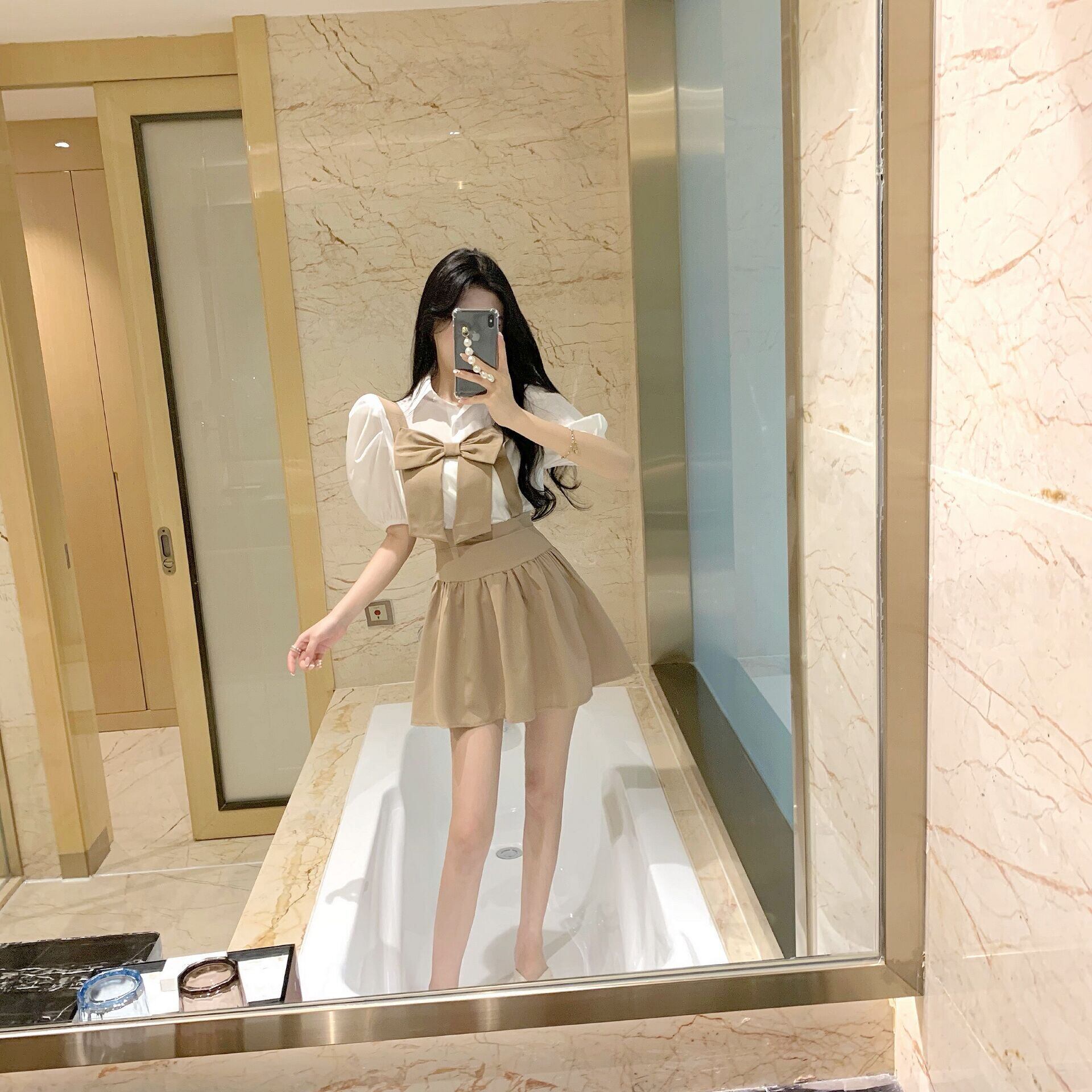 シンプルな白シャツと、リボンとハイウエストのギャザーが可愛いセットです、