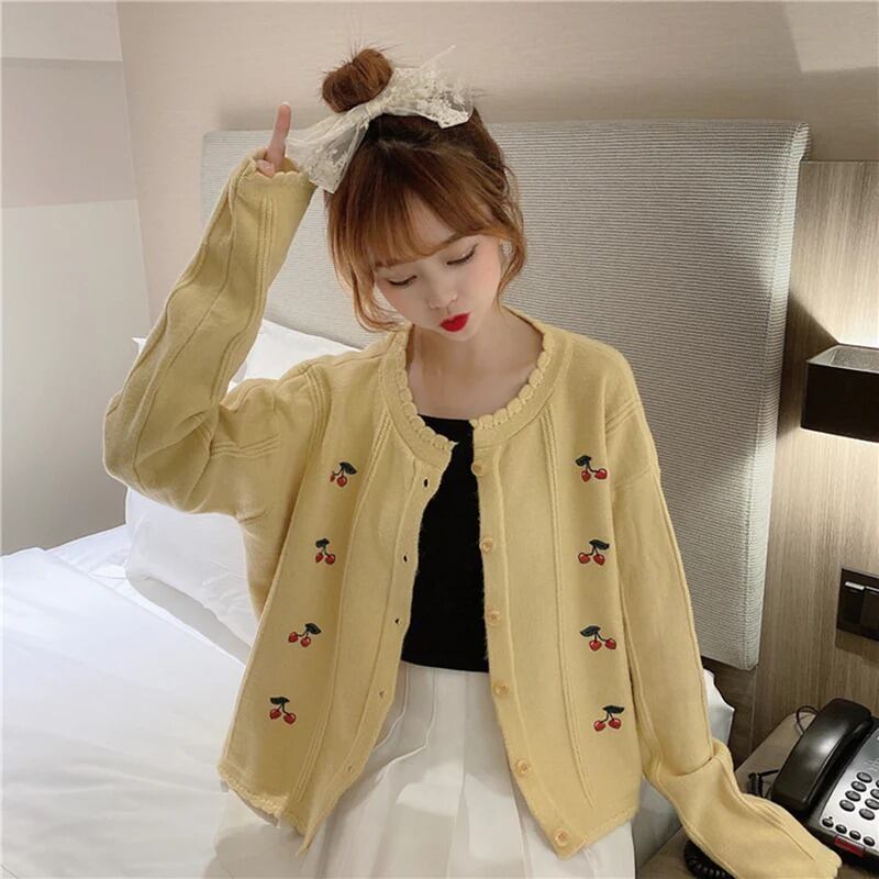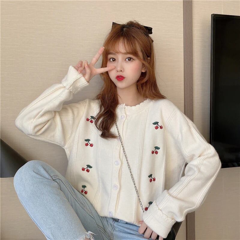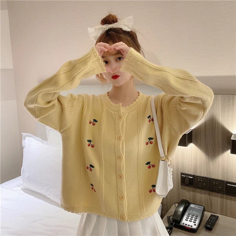 【送料無料】 トップス ニット カーディガン 袖あり 長袖 ラウンドネック 前開き ボタン かわいい 大人可愛い カジュアル おしゃれ お洒落 こなれ感 ラブリー キュート ガーリー 個性的 主役級 存在感 柄 さくらんぼ柄 春 秋 冬 10代 20代 レディース 女の子 学生 通学 デート お出かけ 女子会 休日 旅行 着回し 普段使い 重ね着 お揃い 双子 韓国 韓国系 オルチャン ファッション コーデ スタイル モテ XL 2XL 3XL 4XL 大きいサイズ 色展開 白 ホワイト イエロー
