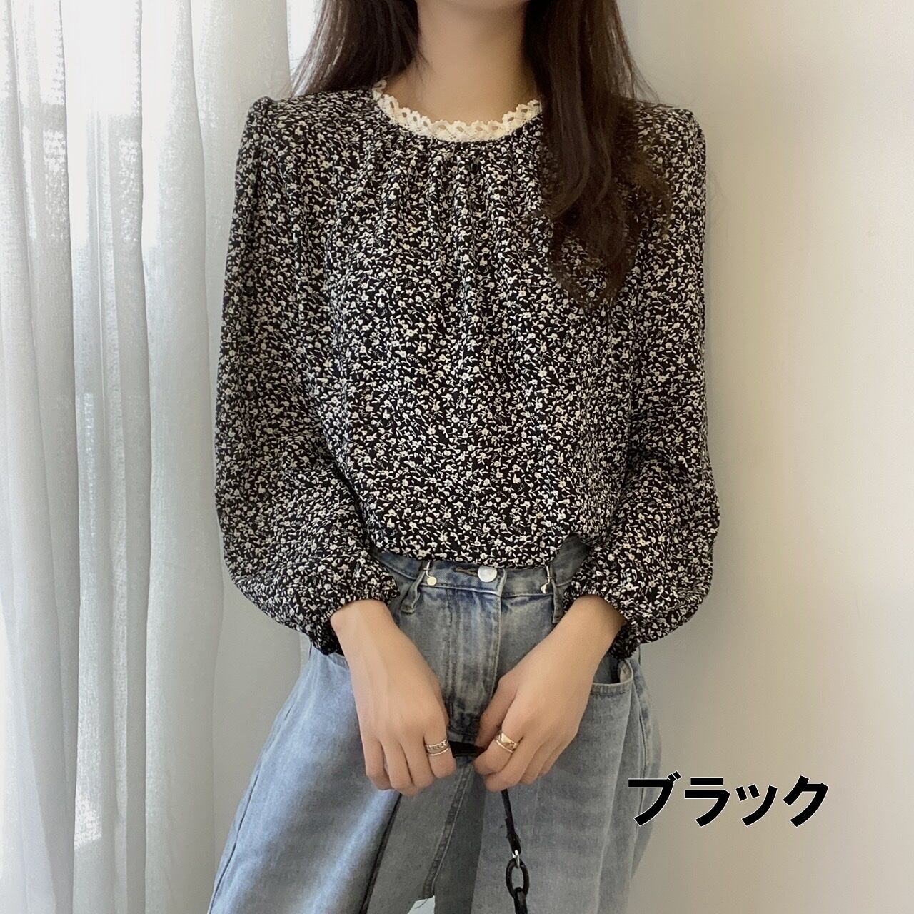 【送料無料】トップス ブラウス ショート ショート丈 長袖 小花柄 フラワー パフスリーブ レース襟 キャンディースリーブ シャーリング 襟なし スリム 細身 かわいい 大人可愛い きれいめ カジュアル 大人 上品 おしゃれ お洒落 レトロ 大人女子 ラブリー キュート ガーリー 個性的 主役級 存在感 柄 小花柄 フラワー 春 夏 10代 20代 レディース 学生 通学 デート お出かけ 女子会 休日 旅行 着回し 普段使い 重ね着 ファッション コーデ ワンサイズ ブラック ブルー アプリコット