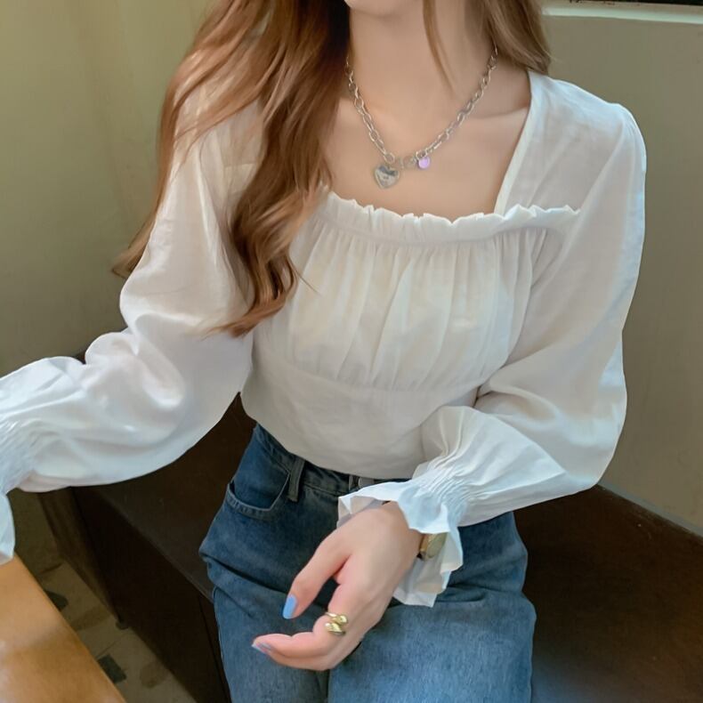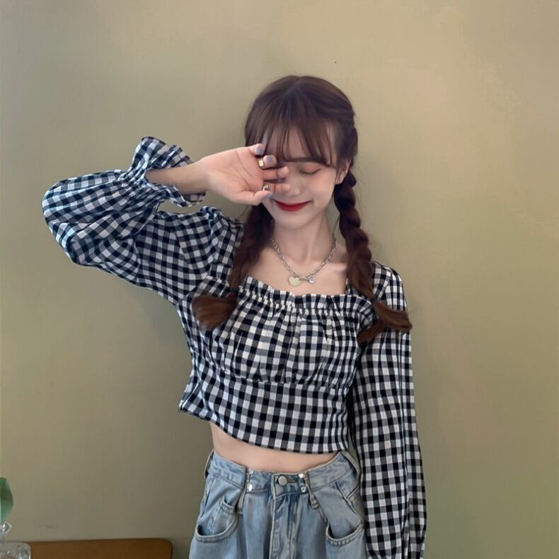 【送料無料】トップス ブラウス 長袖 パフスリーブ クロップ丈 ショート丈 チェック スクエアネック かわいい ギャザー 大人可愛い きれいめ シンプル 大人 上品 おしゃれ お洒落 大人女子 こなれ感 ラブリー キュート エレガント 主役級 存在感 無地 春 秋 10代 20代 30代 レディース オフィス ビジネス OL 通勤 学生 通学 デート 女子会 休日 着回し 普段使い韓国系 オルチャン ファッション コーデ スタイル モテ 新作 プチプラ トレンド 流行 S M L 色展開ブラック ホワイト
