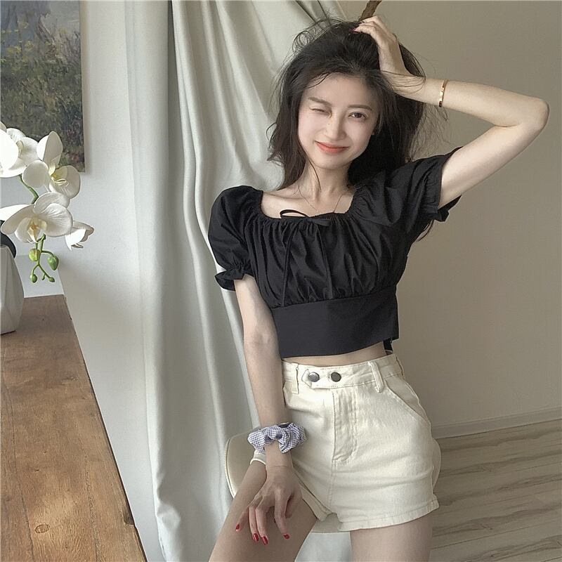 【送料無料】トップス ブラウス ショート ショート丈 袖あり 半袖 ギャザー ホワイト ブラック ピンク ハイウエスト リボン バックコンシャス バックオープン スクエアネック パフスリーブ シャーリング スリム かわいい 大人可愛い きれいめ カジュアル 大人 上品 おしゃれ お洒落 レトロ 大人女子 ラブリー キュート ガーリー 個性的 主役級 存在感 春 夏 10代 20代 レディース 学生 通学 デート お出かけ 女子会 休日 旅行 着回し 普段使い 重ね着 ファッション