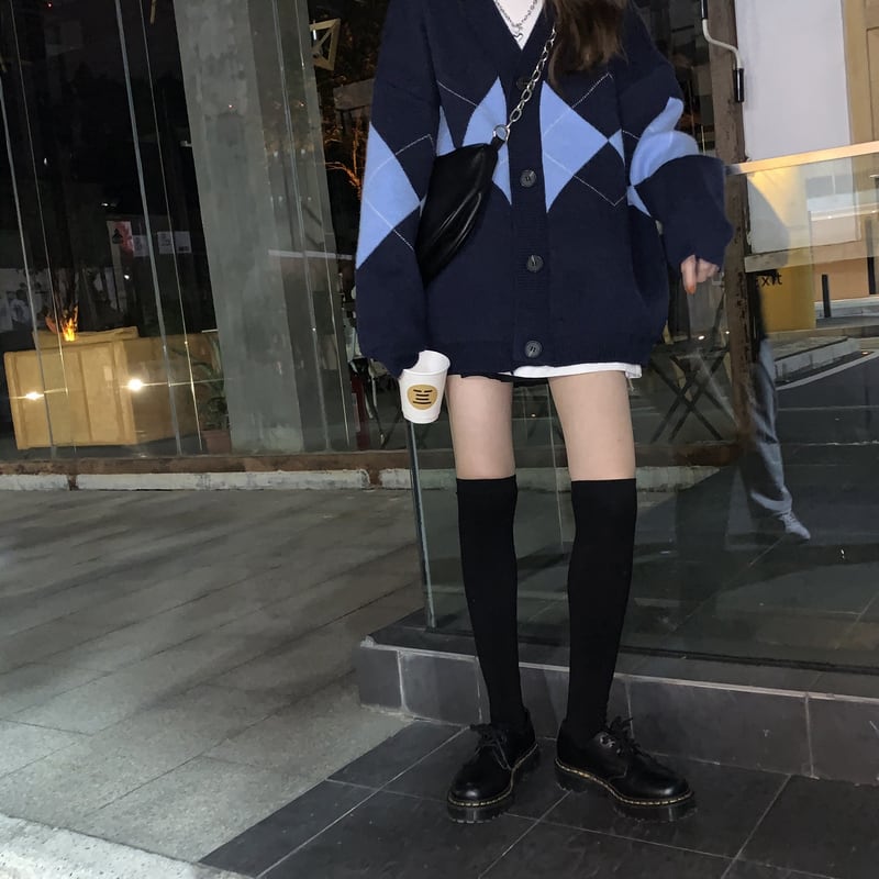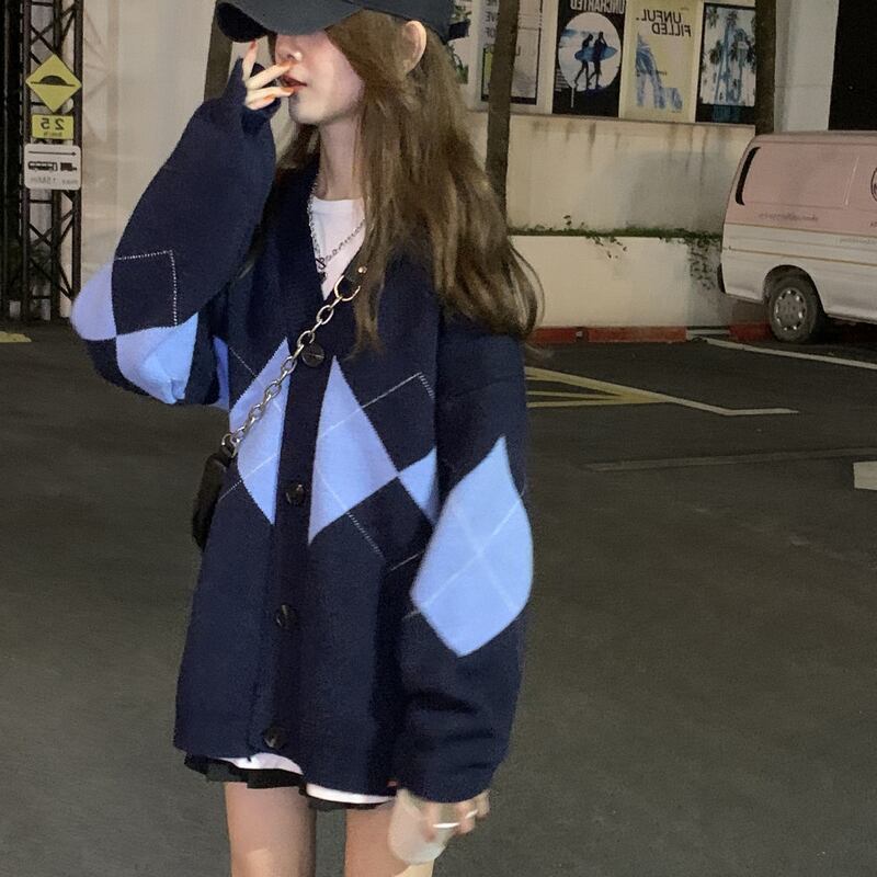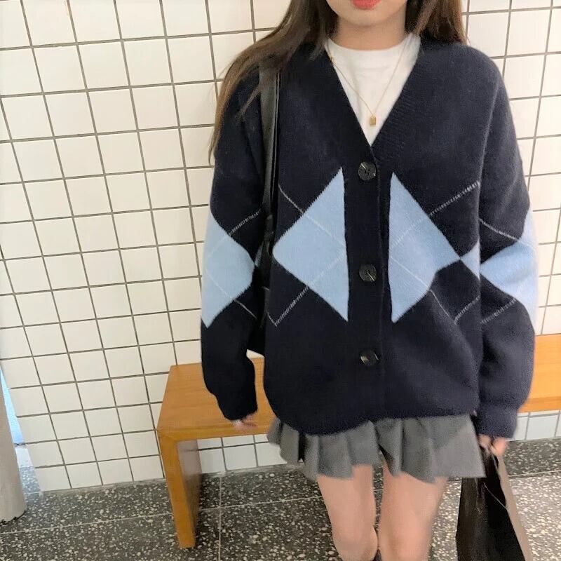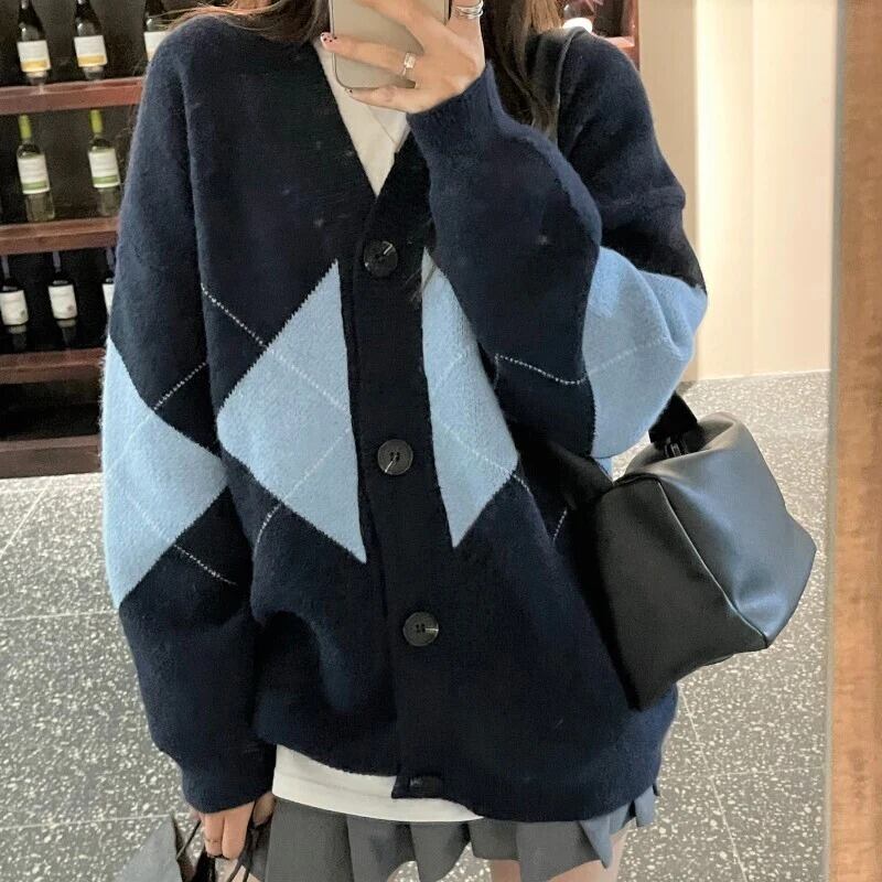 【送料無料】 トップス ニット カーディガン 袖あり 長袖 Vネック かわいい 大人可愛い きれいめ カジュアル おしゃれ お洒落 こなれ感 ラフ ラブリー キュート 主役級 存在感 柄 アーガイル柄 秋 冬 10代 20代 30代 レディース 女性用 OL 通勤 学生 通学 デート お出かけ 女子会 休日 着回し 普段使い 重ね着 韓国 韓国系 オルチャン ファッション コーデ スタイル 体系カバー トレンド 流行 インスタ映え S M L XL 2XL ブルー ネイビー