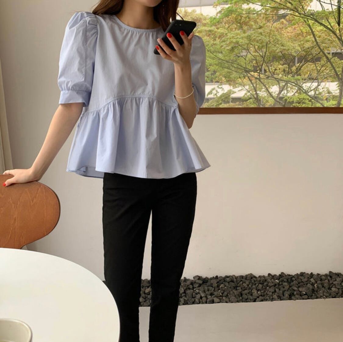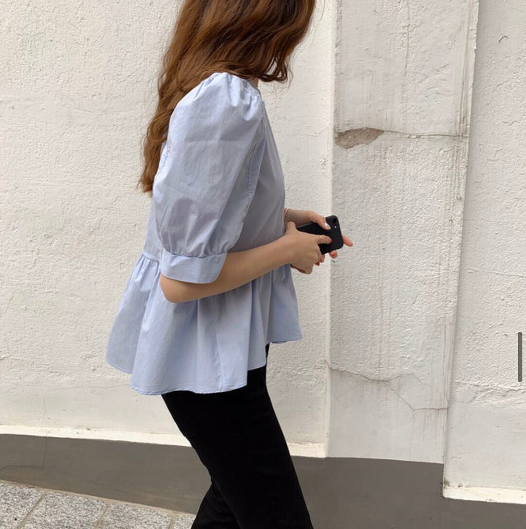 【送料無料】トップス シャツ ブラウス プルオーバー タック 切り替え パワーショルダー ギャザー ペプラム ミディアム丈 半袖 ラウンドネック 襟なし かわいい 大人可愛い きれいめ シンプル カジュアル おしゃれ お洒落 大人女子 こなれ感 ラブリー キュート 主役級 存在感 無地 夏 10代 20代 30代 レディース ママ 学生 通学 デート お出かけ 公園デビュー 女子会 休日 リゾート 旅行 着回し 普段使い 韓国系 コーデ スタイル 楽ちん モテ トレンド ガーリー ブルー