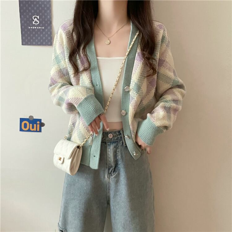 【送料無料】 トップス カーディガン チェック柄 ニットソー コンパクト丈 ショート ショート丈 長袖 Vネック かわいい 大人可愛い シンプル カジュアル 大人 おしゃれ お洒落 かっこいい 大人女子 こなれ感 ラフ ラブリー キュート ガーリー 個性的 主役級 存在感 秋 冬 10代 20代 30代 レディース 女性用 学生 通学 デート お出かけ 女子会 お泊まり 休日 イベント リゾート 旅行 着回し 普段使い 重ね着 お揃い 双子 韓国 韓国系 オルチャン モテ フリーサイズ グリーン ピンク