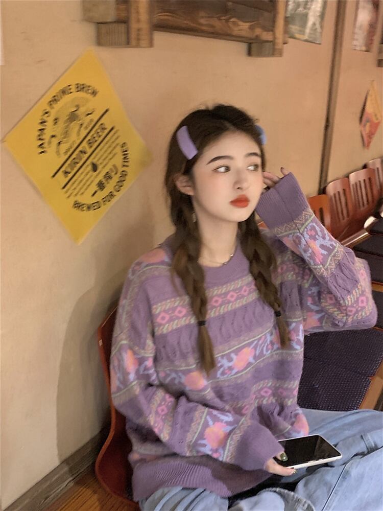 【送料無料】 トップス ニット セーター プルオーバー 袖あり 長袖 ラウンドネック かわいい 大人可愛い カジュアル おしゃれ お洒落 レトロ ラブリー キュート 主役級 存在感 柄 花柄 冬 10代 20代 30代 レディース 女の子 学生 通学 デート お出かけ 女子会 休日 着回し 普段使い お揃い 韓国 韓国系 オルチャン ファッション コーデ スタイル モテ トレンド 流行 インスタ映え S M L ゆったり ゆる オーバーサイズ 紫 パープル ベージュ
